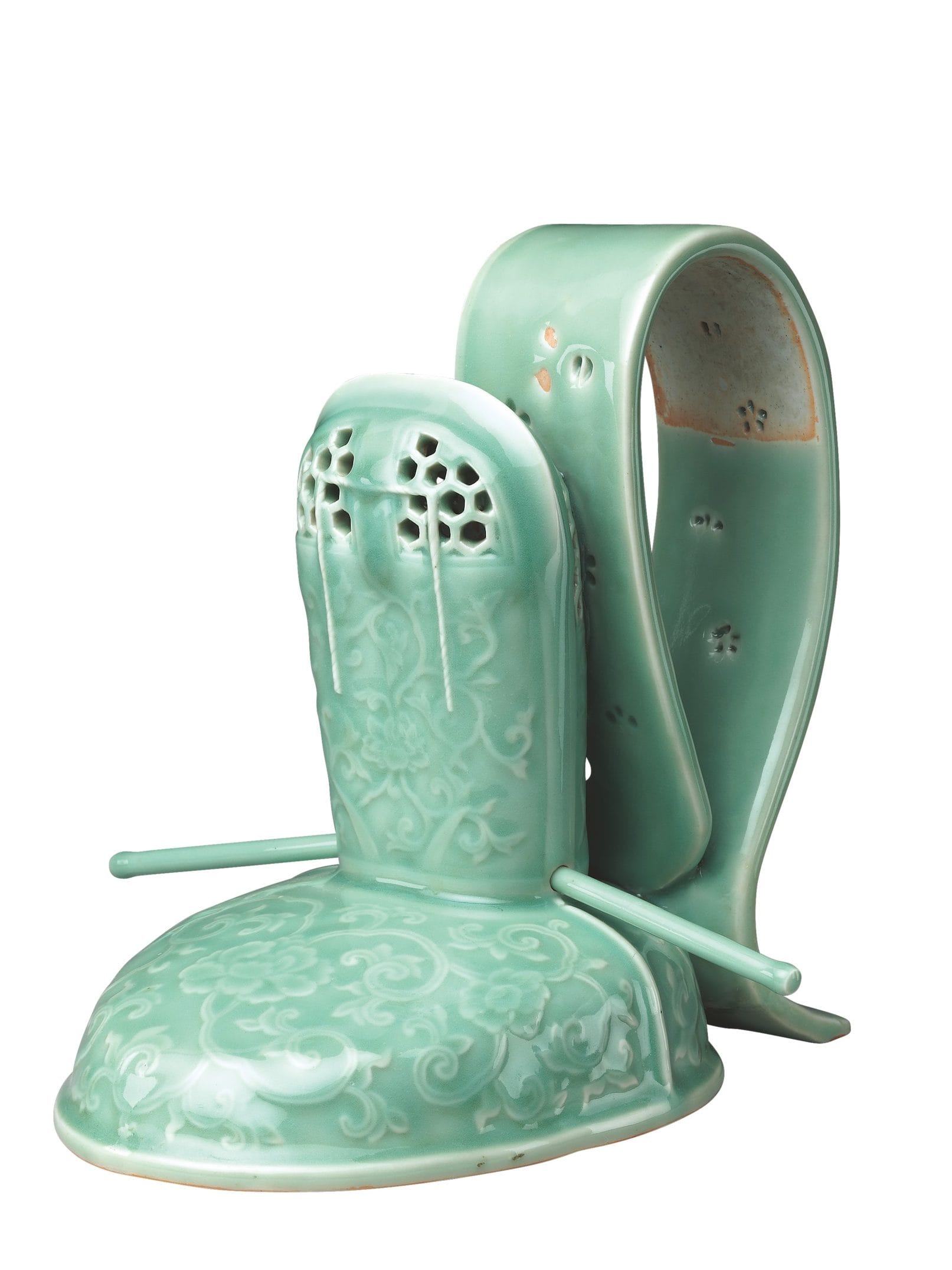 Many interdisciplinary foci can be applied to censers — an anthropological study of their cultural uses, for instance, or an archaeological take on their making across various locales. Indeed, censers also demand art historical attention. While Holy Smoke charts history, I wonder if those ritual objects might have a place in contemporary art. Glimpses of costume-heavy and prop-laden performances by Pakistani artist Amin Gulgee come to mind. For performative works like “4Makers” (2019), and “Eating El Dorado” (2021), Gulgee made fuming agarbatti censers out of readymade bottles of sulphuric acid, flower pots, and glass mosaic. Gulgee is less invested in carrying on “historical” traditions than creating new ones: “Incense reminds me of birth, death, mourning, processions, individuality, collective energies, and ritual,” he told me in an interview. “It is the evocation of smoky fantasies, desires, and dreams that I am after.”