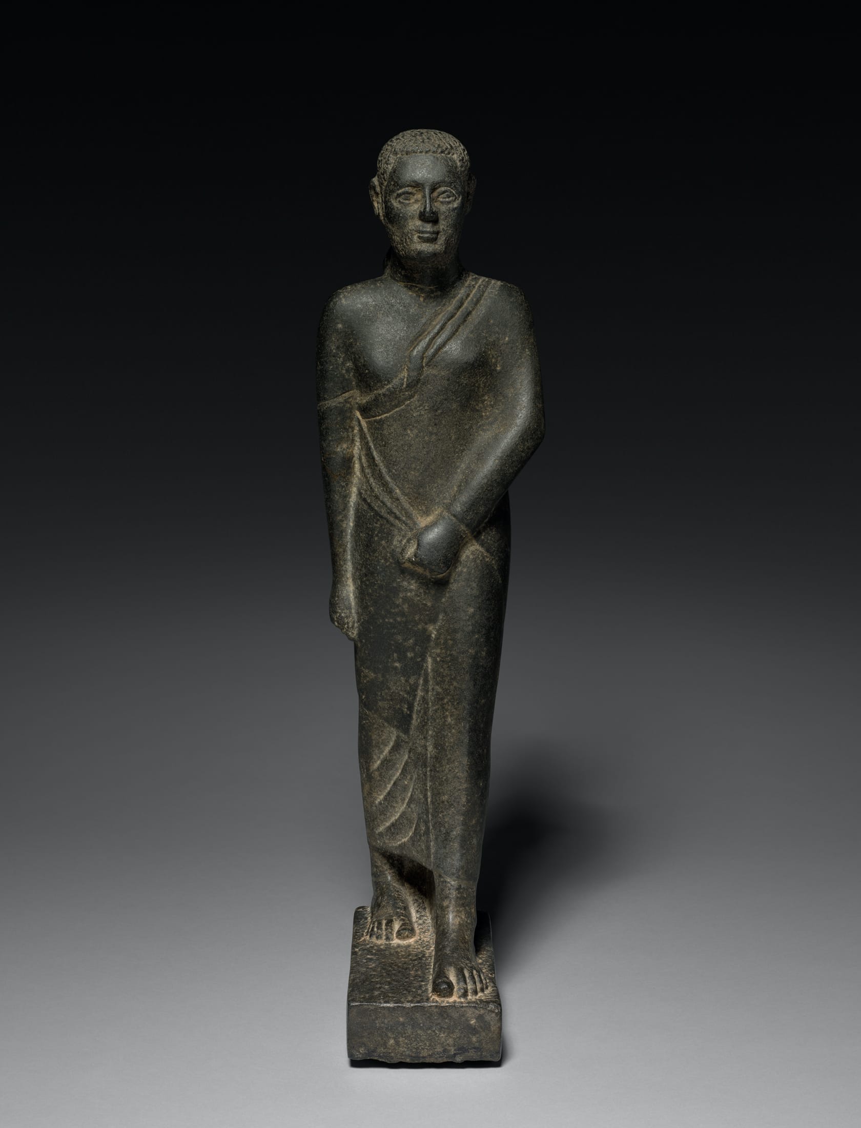 The Roman or Greek Hellenistic basalt statue, described by the museum as a "fascinating combination of old and new," was created during Egypt's Ptolemaic period, the final and longest era of the ancient empire's history. The work, which stands a little under two feet tall, depicts a man dressed in a shirt, shawl, and wraparound skirt. The choice of clothing and rendering of the figure's natural hair are consistent with the era, but the striding pose and curvature of the subject's body evoke older Egyptian sculptural traditions.
