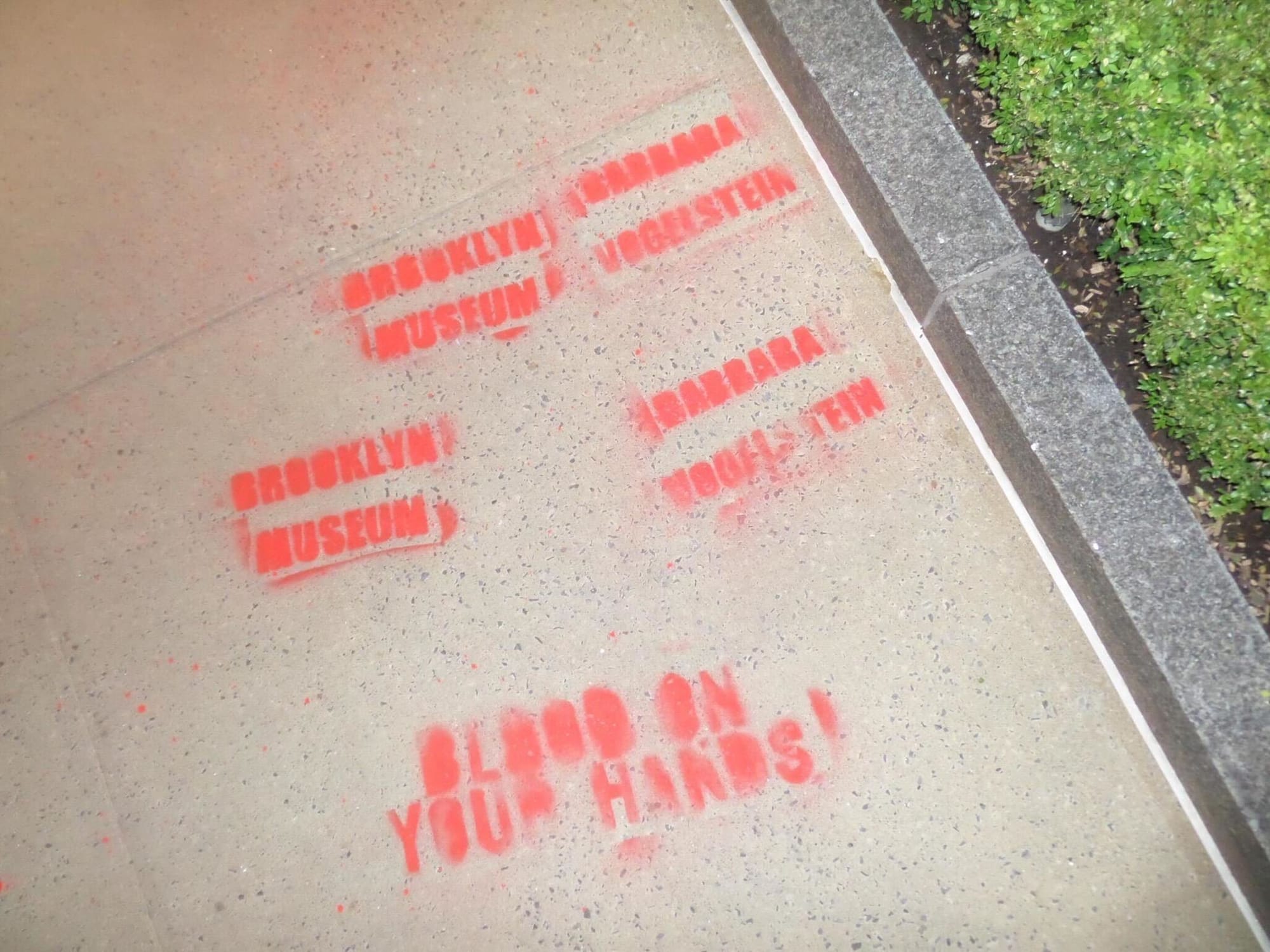 The residences of four Brooklyn Museum leaders including Director Anne Pasternak were graffitied in red paint early today, June 12, in an autonomous action denouncing the institution’s ties to “shameless complicity in genocide,” according to a statement from an anonymous group claiming responsibility.