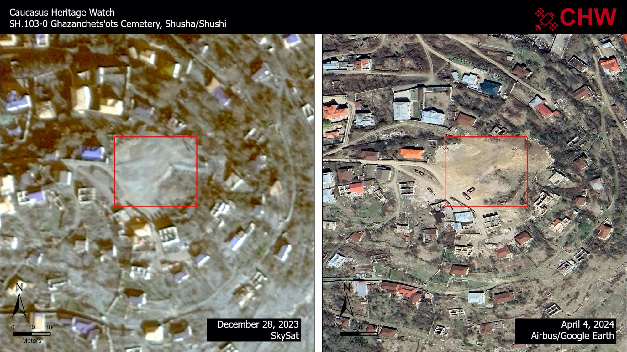 Included in the report was the demolition of Kanach Zham church (Armenian for "Green Chapel") as well as the completed destruction of the Ghazanchetsots cemetery in Shushi after CHW data yielded evidence of earlier damages to both cultural sites. At the base of the hill Shushi was built on, a village called Karintak ("Dashalty" to Azerbaijanis) was completely leveled between last fall and April of this year, likely to make way for a new Azerbaijani residential settlement.