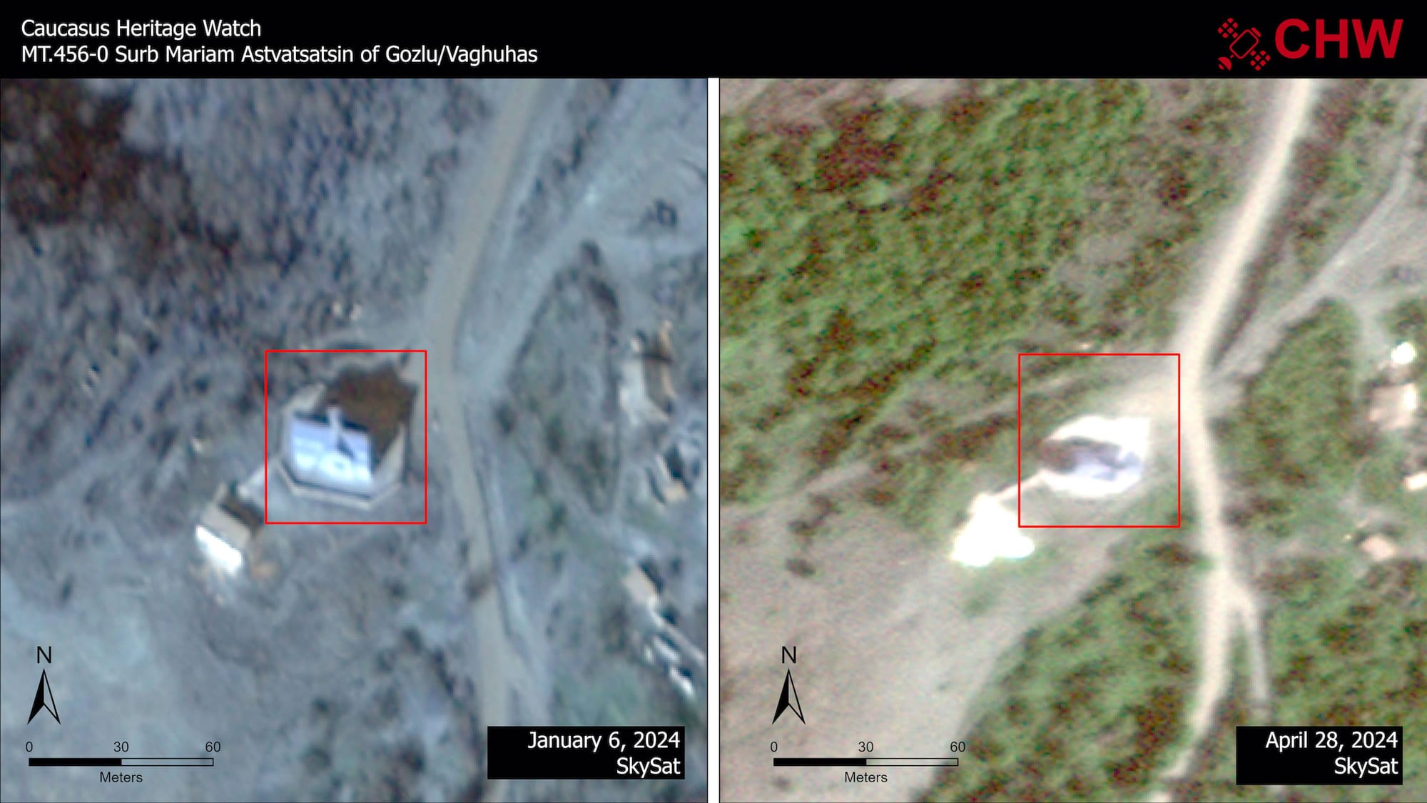 Through satellite image comparisons between fall 2023, when more than 100,000 ethnic Armenians were forced out of their homeland by the autocratic Azerbaijani regime, and spring 2024, CHW's latest report draws attention to the destruction of historic schools, burial grounds, and sacred places, and identifies a 29% increase in sites classified as threatened across Artsakh (also known as Nagorno-Karabakh).
