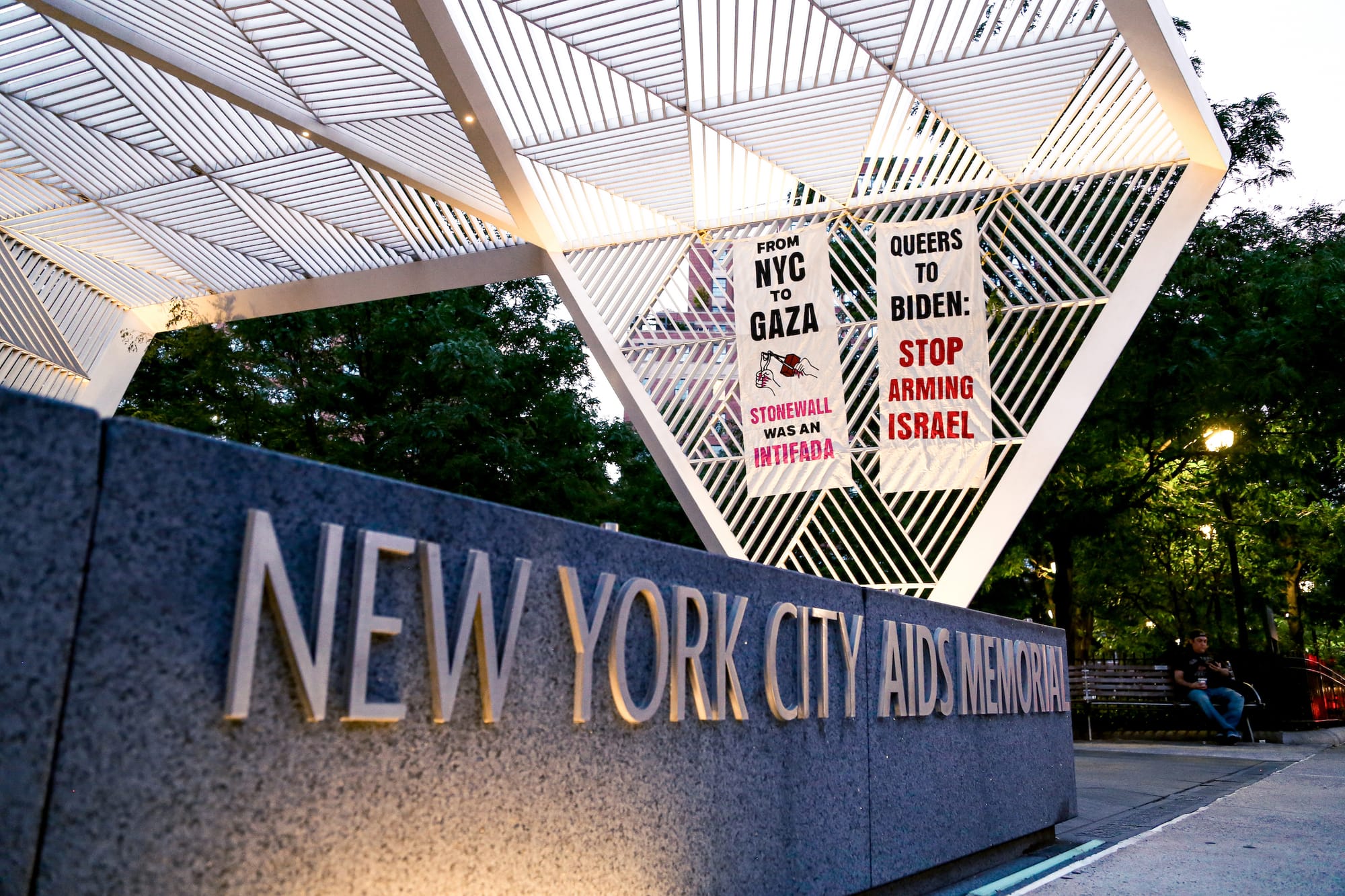 Ahead of the grand opening of the Stonewall National Monument Visitor Center, activists with ACT UP and Jewish Voice for Peace (JVP) dropped two banners at the New York City AIDS Memorial in Greenwich Village, calling on President Biden to stop funding Israel's ongoing attacks on Gaza.
