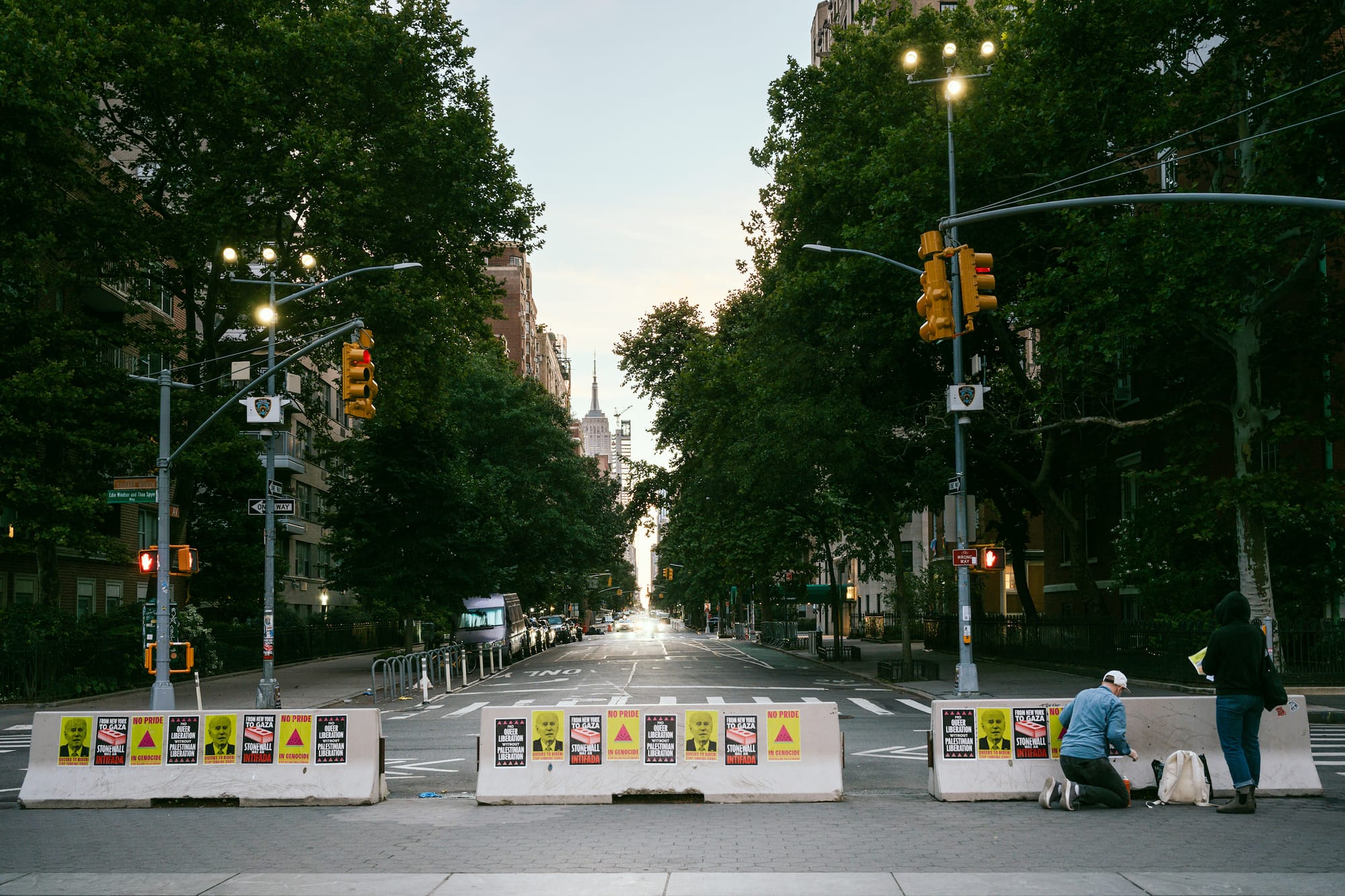 Before the president’s arrival, activists hung two white banners from the triangular AIDS Memorial situated at St. Vincent’s Triangle around 5am. The fabric signs displayed black, red, and pink text reading "Queers to Biden: Stop Arming Israel" and "From NYC to Gaza / Stonewall was an Intifada," referring to the Arabic word for "shaking off" that has historically been used to describe Palestinian uprisings against Israeli occupation. The latter sign was accompanied by a graphic of manicured hands pulling back a brick in a slingshot — a reference to the legendary first brick that was hurled at police officers outside of the Stonewall Inn during the historic uprising.