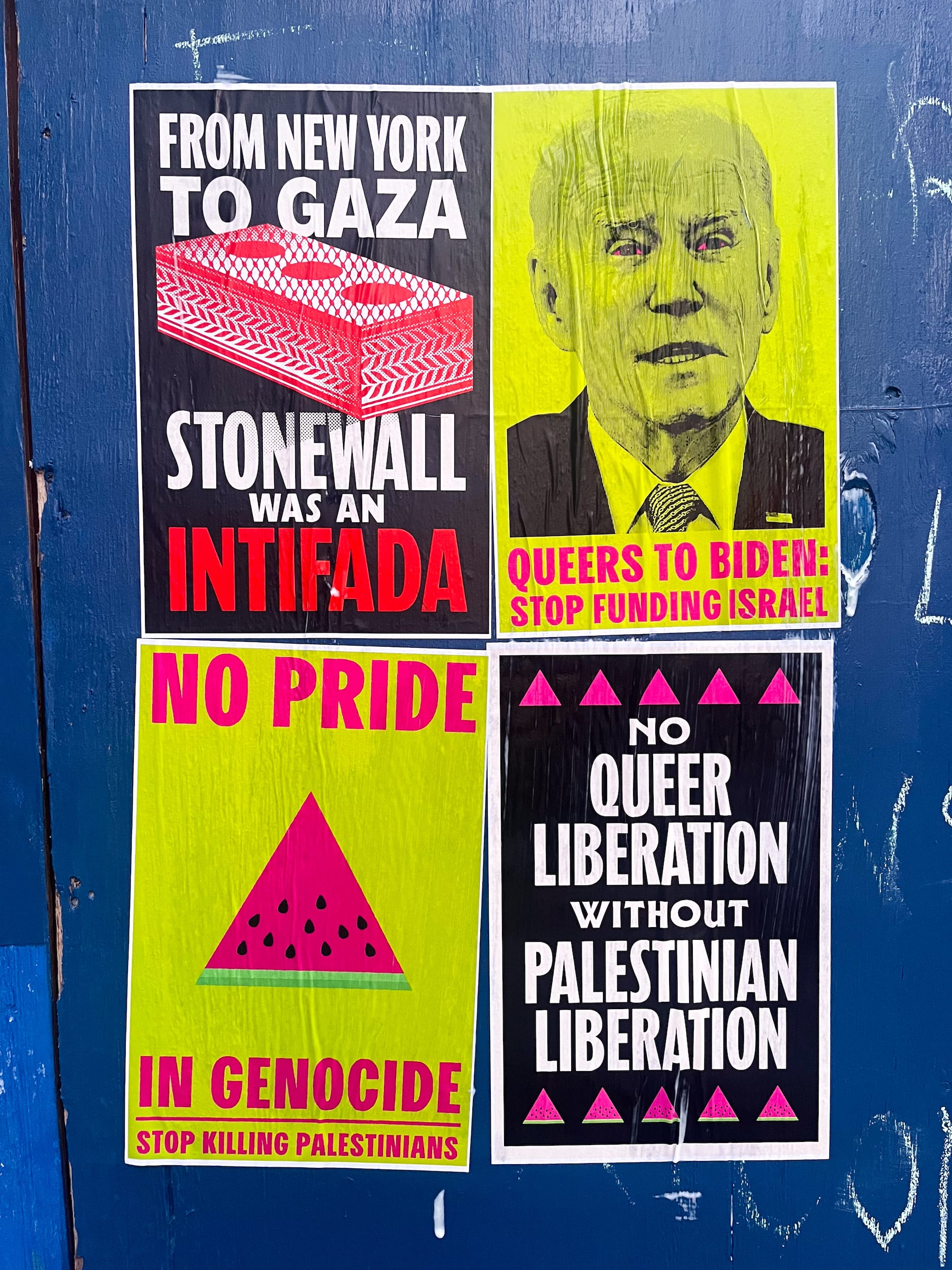 In addition to the banners, activists wheat-pasted posters with pink watermelon triangles inspired by Gran Fury's signature SILENCE = DEATH signage and bricks encased in the same fisherman's netting pattern featured on keffiyehs, alluding to the overlap between the Palestinian liberation movement and LGBTQ+ rights movement. There were also new versions of Gran Fury’s “AIDSGATE” (1987) poster that replaced Ronald Reagan’s image with Biden’s, calling on the president to take action on Israel’s destruction of Gaza by ceasing shipments of American weapons.