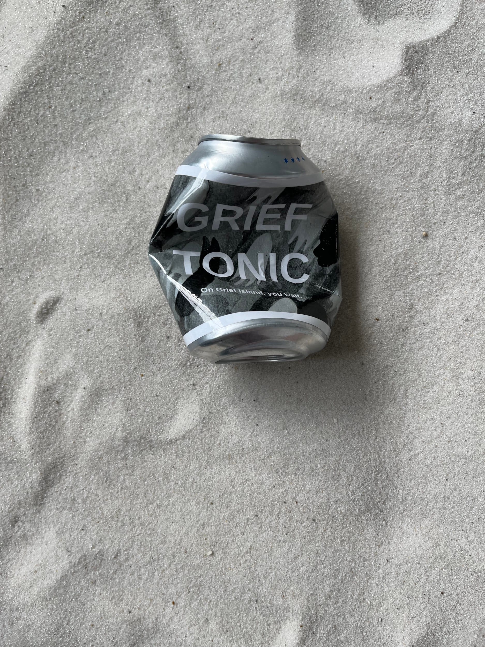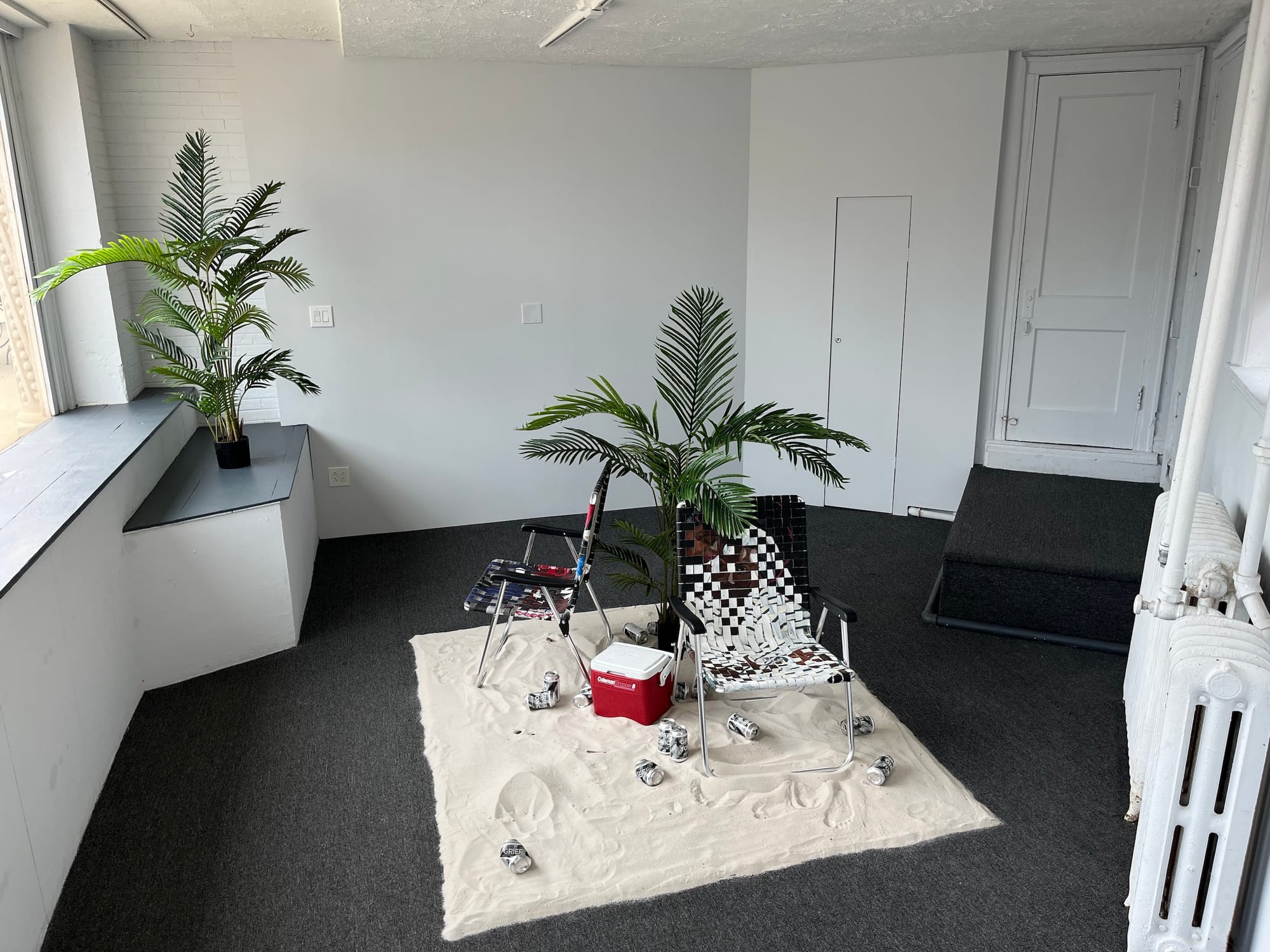 Open since 2012, Roman Susan, only 280 square feet, sits on the ground floor of a flatiron building. The space itself is composed of sharp, diamond-shaped angles, with an expansive storefront window that’s seen over a thousand art exhibitions. In Grief Island, a 400-pound square of sand rests in the gallery’s center. The sand is dotted by crushed cans of “Grief Tonic,” footprints facing in opposite directions, a small palm tree, a red Coleman-brand cooler from the artist’s youth, and two beach chairs whose upholsteries are woven portraits by Akinbola; another palm tree rests in a corner. A postcard carrel and small postbox sit against the window, so visitors can send anyone (including the artist) a card from the island.