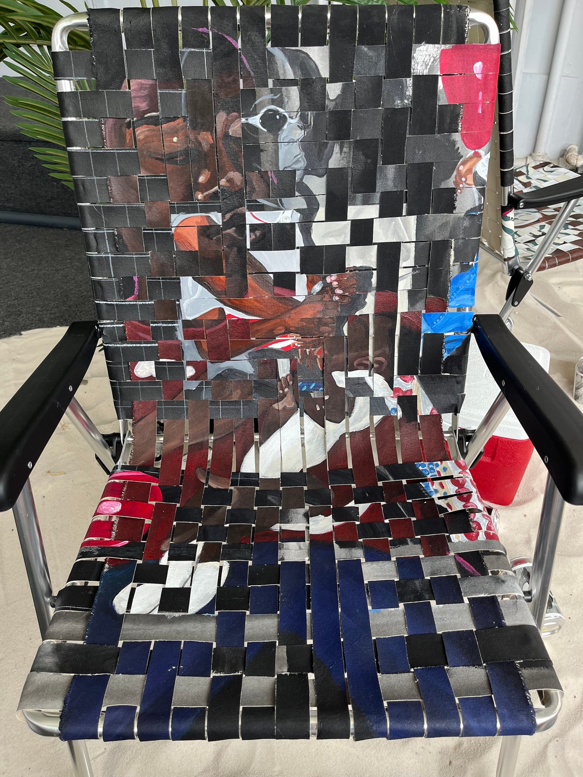 CHICAGO — Grief takes many forms: it can be a caution sign around your heart or a quiet voice that tells you something is irreparably wrong and only you know the expanse of this wrongness. In artist Bimbola Akinbola’s Grief Island, now on view Roman Susan Art Foundation, grief is a solitary place with back-to-back beach chairs and crushed aluminum cans. For Akinbola “Grief Island” is a place of succor and sadness, reserved for mourning and remembrance.