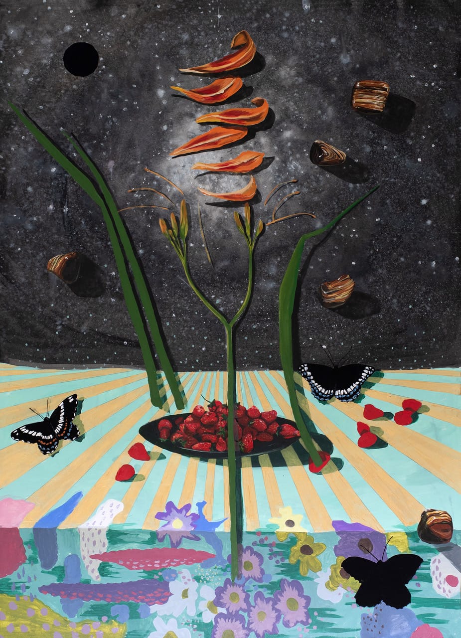 The three-person exhibition Symbolic Convergence features artworks that embrace symbolism and collage. Known for his unique reconfiguration of musical instruments into sculpture, Ken Butler’s “Hip Bone Saz” (2005) combines a slim guitar-like instrument covered in light touches of spray-paint with the pelvis bone of an animal in a work that blends flair, punk, and piety. Linda Ganjian’s meticulous mixed media works bring together ink, watercolor, origami paper, and giclée on paper to create mid-century-modern-meets-sci-fi patterned designs in works such as “Queen of Darkness” (2024). In Melissa Murray’s dreamy acrylic and gouache on paper work “Before You Learned to Harness The Stars” (2022), butterflies and strawberries float above a table that appears to fade into the cosmic landscape above. Taken together, this distinct pairing of three singular approaches demonstrates how symbolism welcomes ornamentation (Butler), representation (Ganjian), and narrative (Murray).