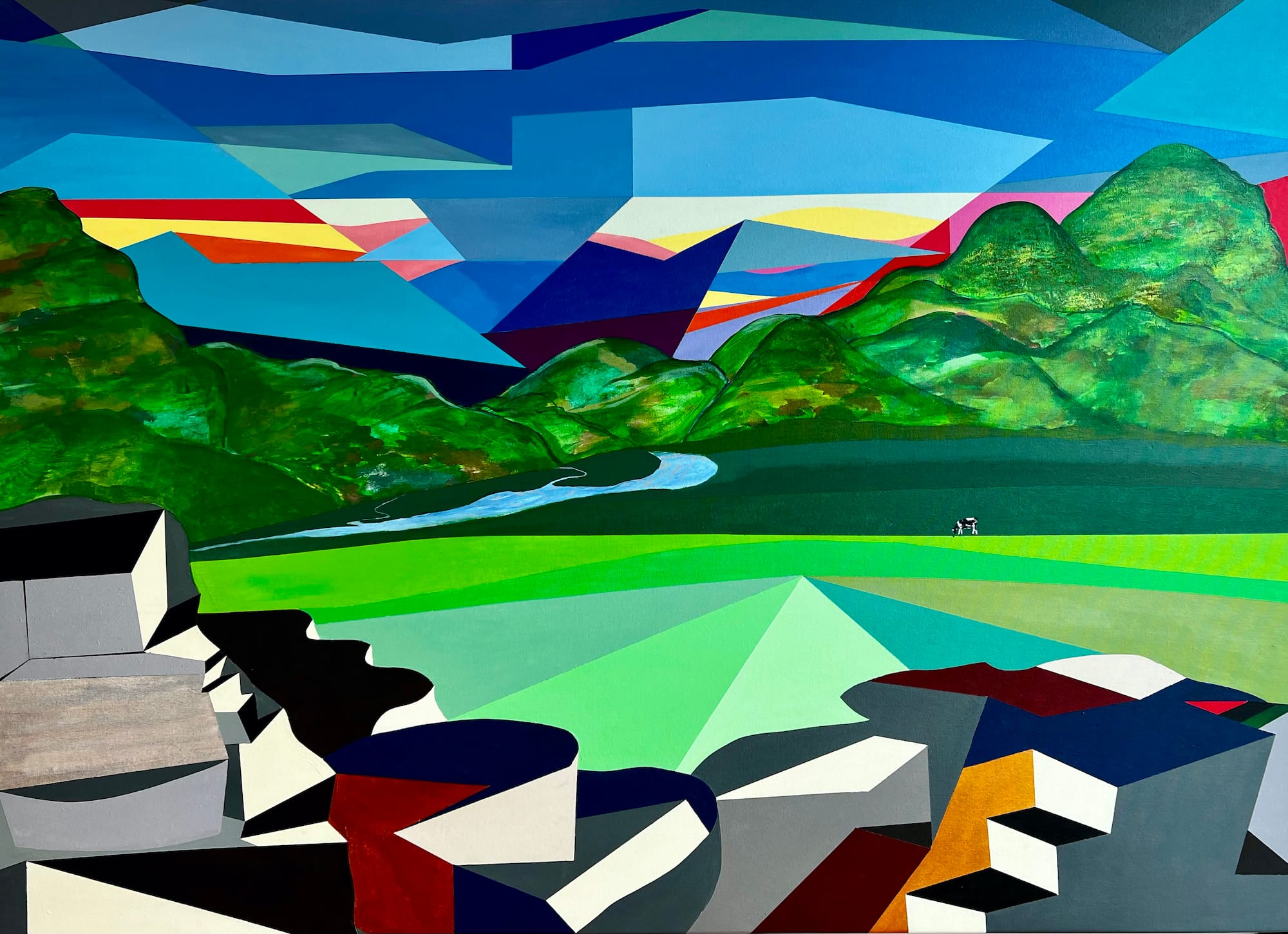 Dave Ortiz commands abstraction with a contemporary edge. A self-described “colorist,” Ortiz spent the 1970s and ‘80s in downtown Manhattan developing his bright, quasi-industrial visual style before moving to the Catskill Mountains of the Hudson Valley. Colored presents a series of 50 paintings and 16 sculptures that combine Pop Art and Minimalist influences. In the painting “PALMER HILL VIEW” (2024), for example, a jagged landscape embraces a smooth disco-lit green of a bucolic field, a lone cow enjoying the psychedelic spectacle. In works such as “CITY” (2024), Ortiz captures a vista of skyscrapers at bold angles, softening the scene with a patchy blue sky above. The strong graphic-like quality of the painting “TREE OF LIFE” (2024) hints at summer nostalgia in the countryside, while his raw wood sculpture “Eagle Up” (2024) solicits a smile for its anthropomorphism.