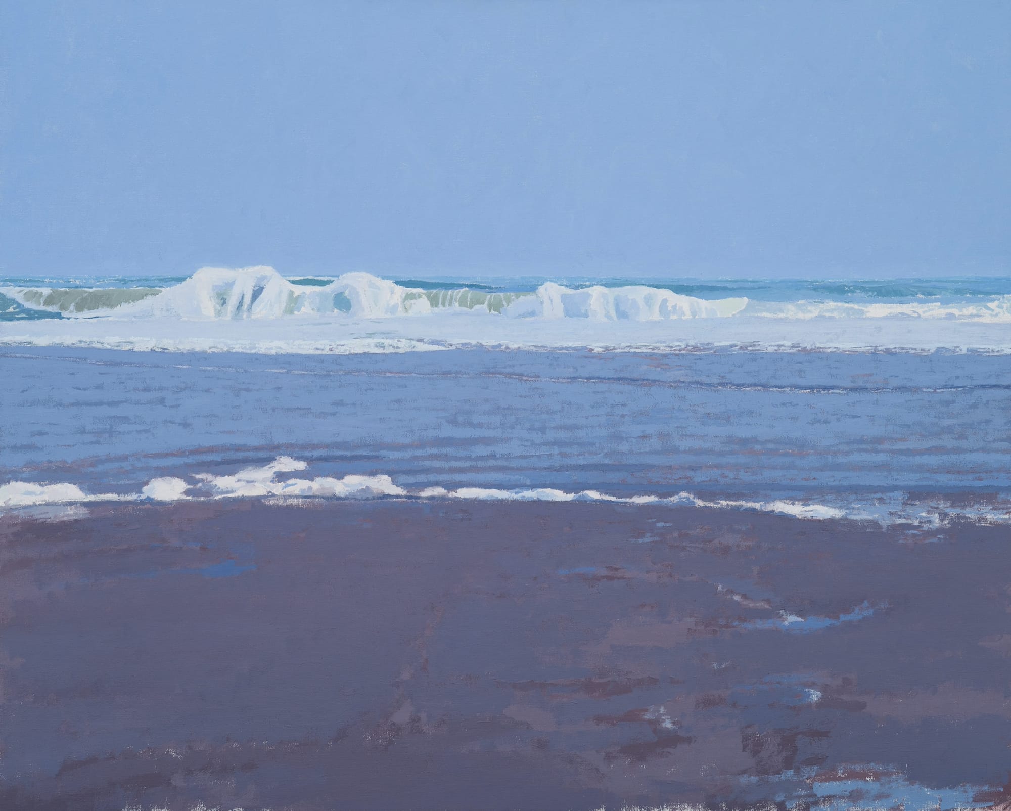 The title Water Works aptly captures the summerly essence of this four-person show at Pamela Salisbury Gallery in Hudson. Homages to water as a divine resource in the form of beach life and coastlines flow into our collective soul. Diana Horowitz’s soft-toned “Corn Hill, High Tide” (2023) is a precise location as indicated by the artist, yet this seaside vision recalls lovely locales all around the world. The computer-generated video “Floating (dusk)” (2021–24) by Adam Hurwitz ships us, floating on our backs, out to sea: A pair of bobbing feet float serenely through day, dusk, and night. While all the aforementioned artworks include sumptuous color, it is Eric Wolf’s nostalgic ink-on-paper work “Philips Preserve 5” (2023) that grounds us in a black, white, and gray-toned vision of a land against water on a somber day, a perfect balance.