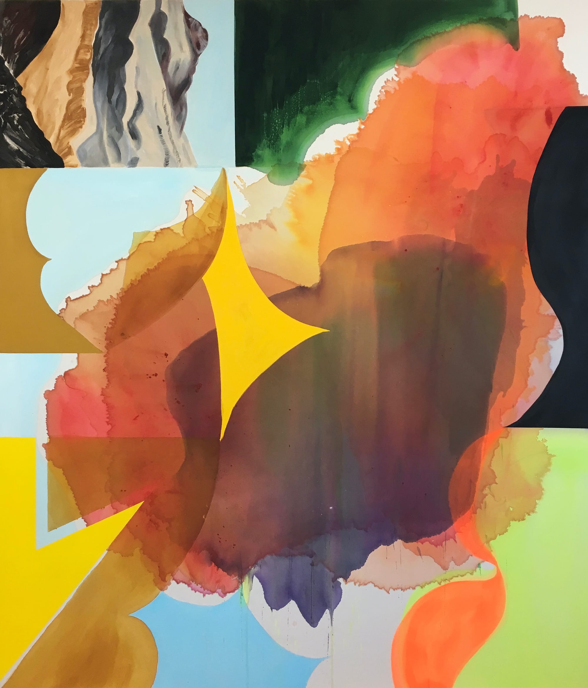 This pairing of the father-daughter duo Ara and Allan Osterweil is a radiant blow-out of unabashed chromatism. These two artists share an affinity for abstraction and landscape painting, ignited by a fantastically wild tonality. “Enigma” (2023) captures the exhilarating flow of Allan Osterweil’s compositions with circular shapes that cross jagged, mountain-like lines. Ara Osterweil’s all-over color explorations include her large-scale “Autofiction” (2024), an expressionistic and surrealist vision of a lone naked female figure anchoring an otherwise abstract environs.