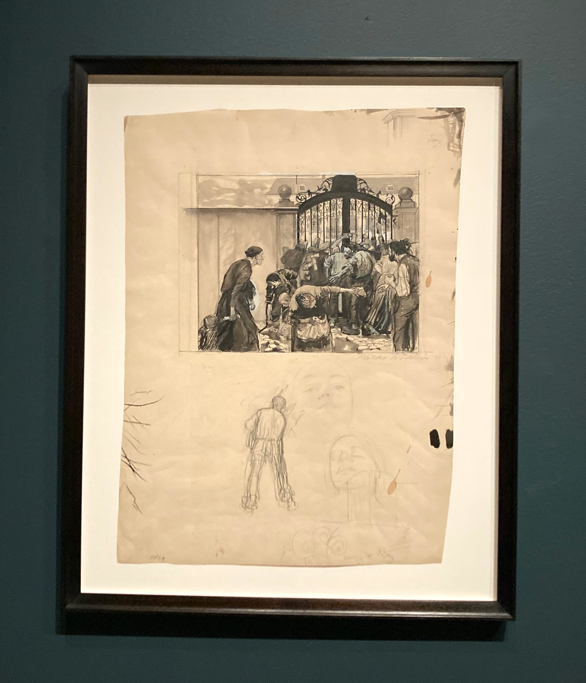 Even in these images, the artist focuses on human suffering, rather than a triumphant revolution, and on the mothers carrying their children. Kollwitz does not show the violent climax of the revolt. Instead, the final plate is the aftermath, as the bodies of weavers killed in the revolt are carried into and laid on the floor of the mill. The decision to present both studies and finished plates in this case is incredibly effective. In the ink and pencil study, a woman clasps her hands together as she watches over the scene; in the margins are sketches of the same figure seated or with her head bowed differently. In the final print, her hands are in fists at her side; the resulting grief-stricken, helpless fury, rather than the more passive surrender of the first draft, is so much more powerful.