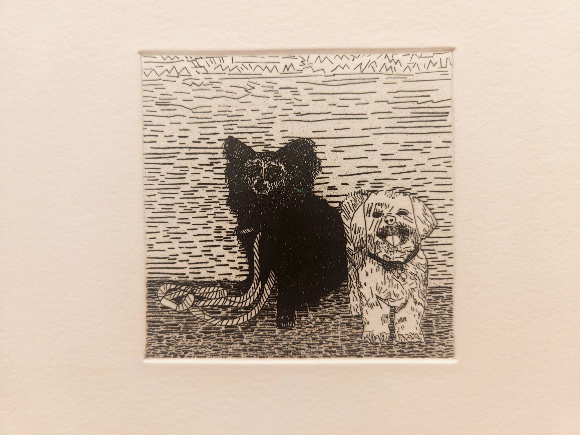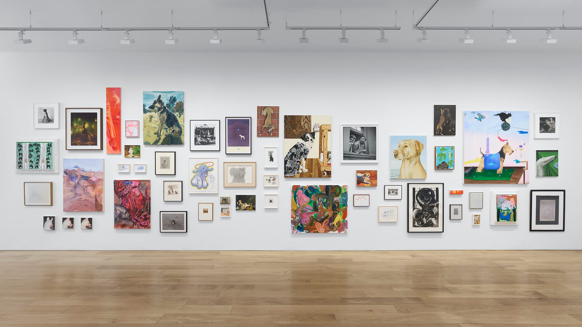 On view through August 23, the collaboratively organized exhibition features over 60 artworks by 47 emerging, mid-career, and established artists. With a blasting air conditioner, water bowls filled to the brim, and a glass jar of bone-shaped treats at the entrance, the gallery has made it clear that the four-legged stars of the show are welcome to comfortably peruse the show accompanied by their human escorts.
