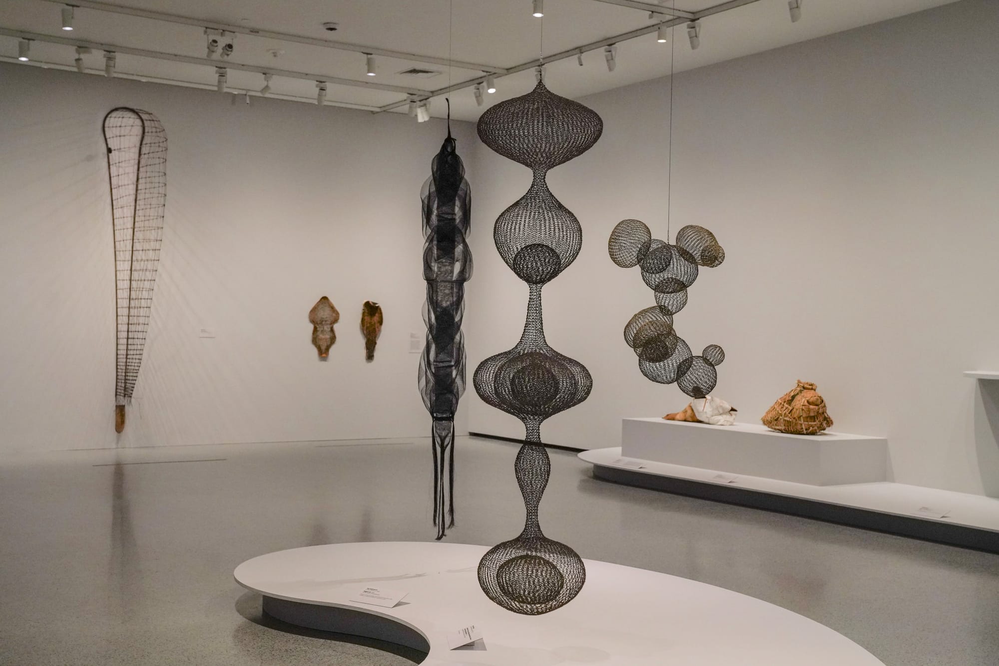 The journey continues with a sampling of baskets and modern woven sculptures, spotlighting off-loom weaving techniques. A curvy, looped wire Ruth Asawa sculpture and Yvonne Koolmatrie’s conical, spiny sedge grass “Eel Trap” (2003) dangle from the ceiling. Shelves filled with small baskets, including several by Ed Rossbach and Lillian Elliot, line one wall, and Martin Puryear’s wire-and-rattan “Greed's Trophy” (1984) emerges from another like a whale fin.