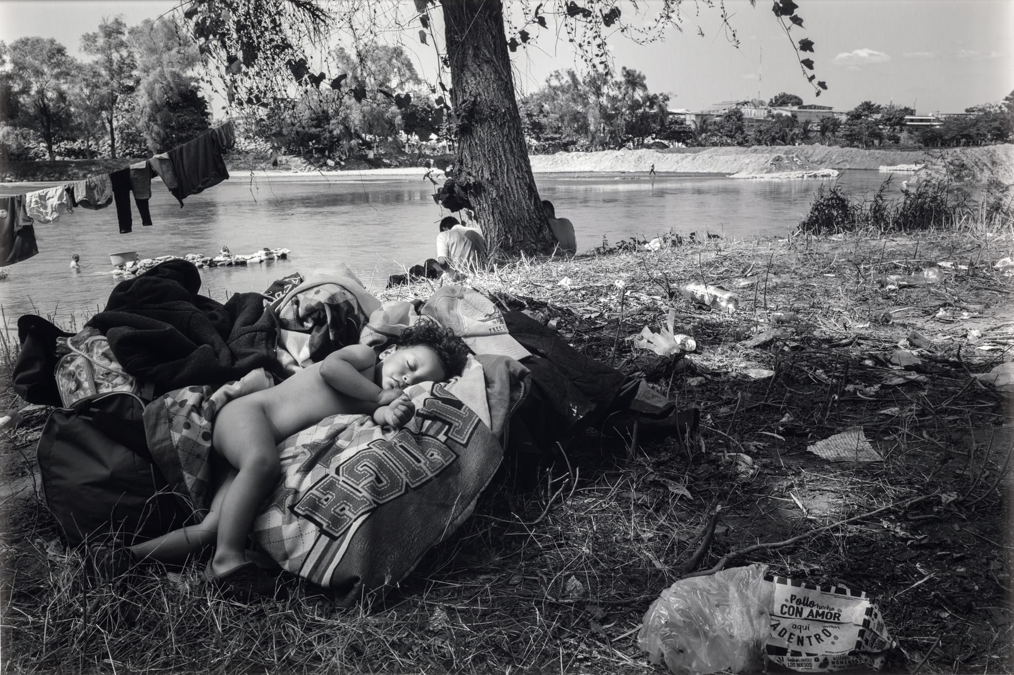 “The way everyone took care of one another was very beautiful,” she told Hyperallergic, recalling how her companions offered her a mask for protection against the tear gas launched by Mexican authorities. Her images are made in a black-and-white cast to intentionally strip away distractions. “I don’t want someone to think, ‘Look at that little boy, how sad,’” she said. “I want them to have an experience worthy of the sacrifice that these people have made.”