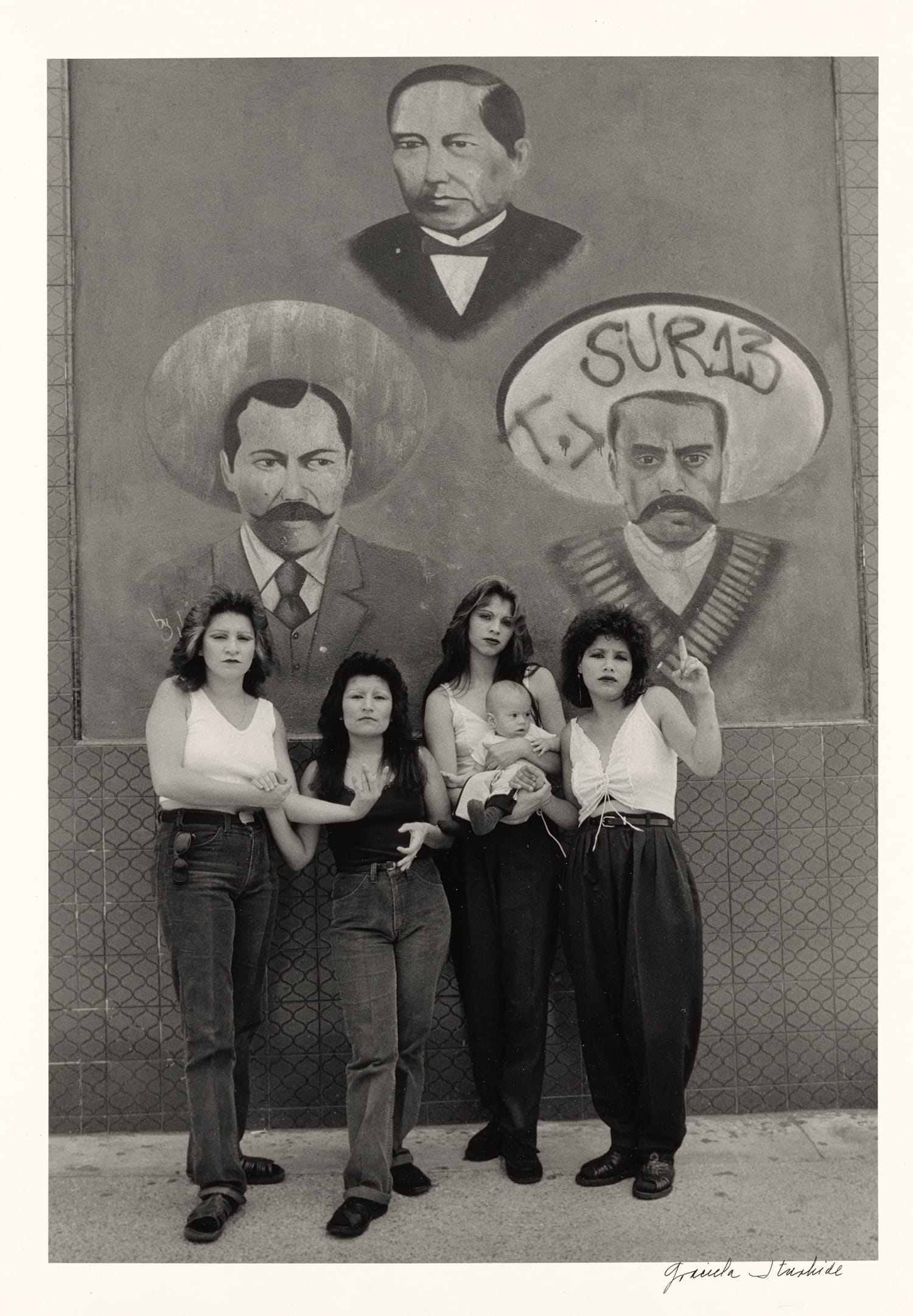 Iturbide’s images reflect this peripherality. In “Cholos, White Fence, East Los Angeles” (1986), four female gang members pose in make-up and sleeveless shirts in front of a wall in the Boyle Heights neighborhood that bears the portraits of three male Mexican icons: revolutionary leaders Pancho Villa and Emiliano Zapata and 19-century president Benito Juárez. One of them embraces her newborn. The ostensible dualities within the photo — the US and Mexico, female and male, violence and motherhood — reveal four women who exist along the frontiers of seemingly contradictory but coexistent identities.