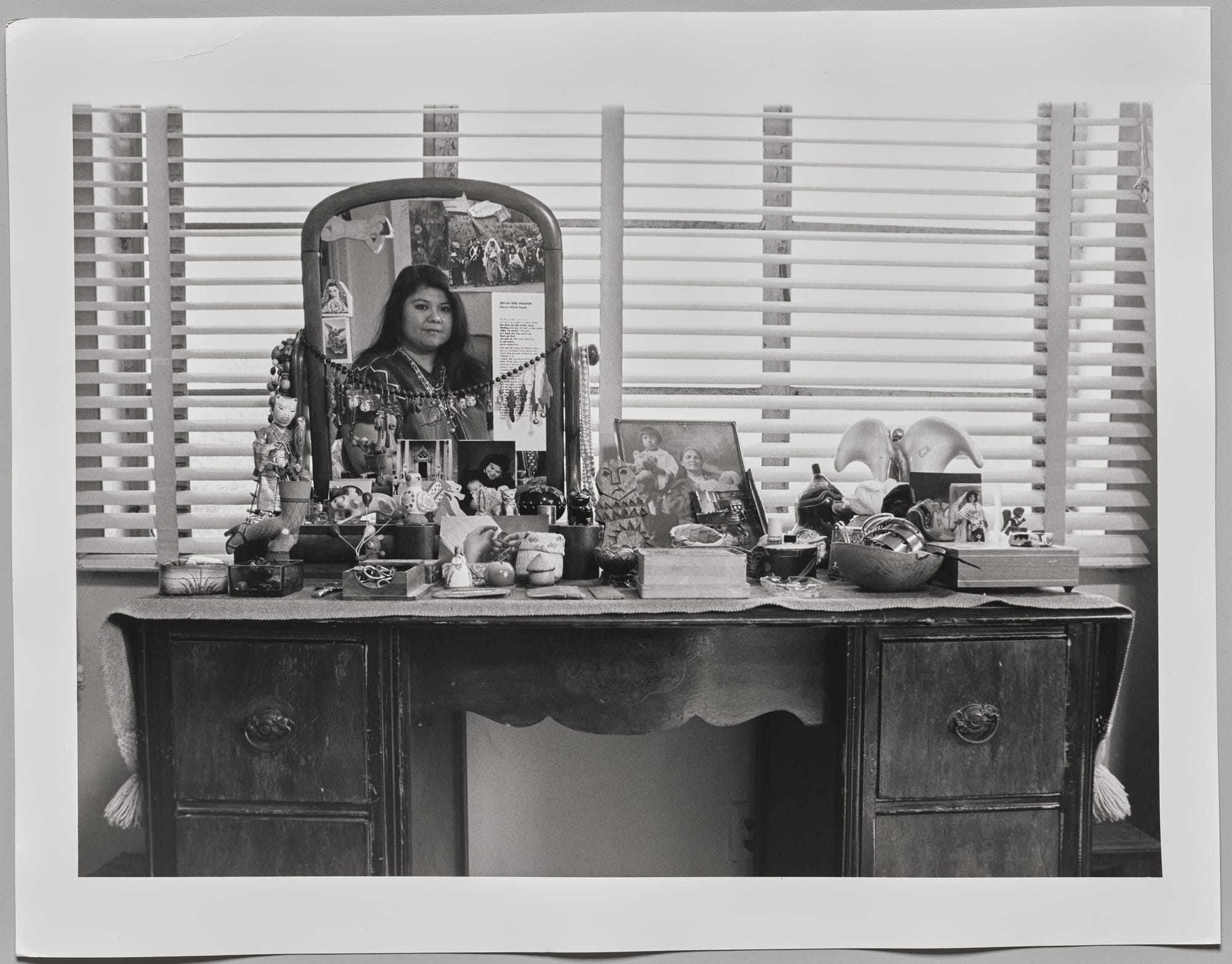 Among the works exploring these themes is the late photographer Laura Aguilar’s black-and-white portrait “Yrenia Cervantes" (1990), in which the titular Chicana muralist and artist stares at her reflection in her dresser mirror. Her bedroom is decorated in the elaborate style of an altar: It includes photos, iconography, and handmade objects. Cervantes is simultaneously of the border and beyond it — the viewer can’t easily determine to which side she belongs.