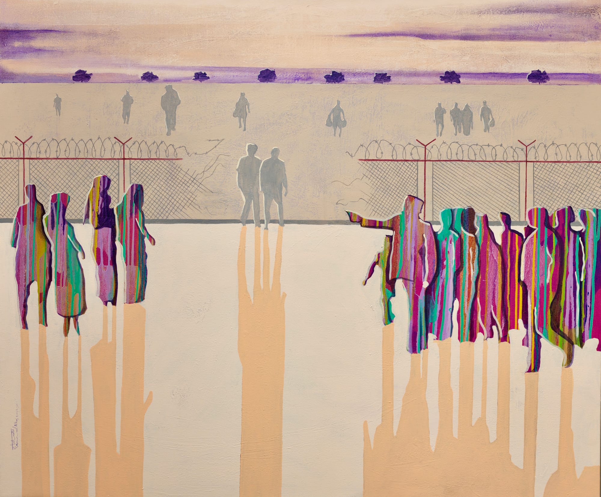 Saleh shared an image of a painting by Gaza-based Palestinian artist Mohammed Alhaj that is currently on view at the museum. Painted in 2021, two years before the events of October 7, “Gaza Displacement” depicts multicolored silhouettes streaming through a hole ripped in a razor-wire-topped chain-link fence.