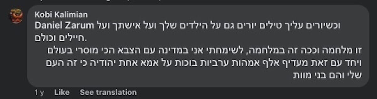 Kobi Kalimian's response to another commenter on his post, saying that "in a country with the most moral army in the world, I still prefer a thousand Arab mothers crying to one Jewish mother." He referred to Arabs as "the sons of death," an expression for people who deserve to die.
