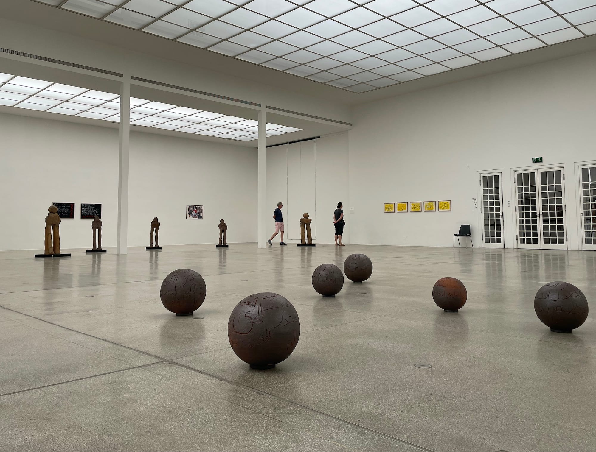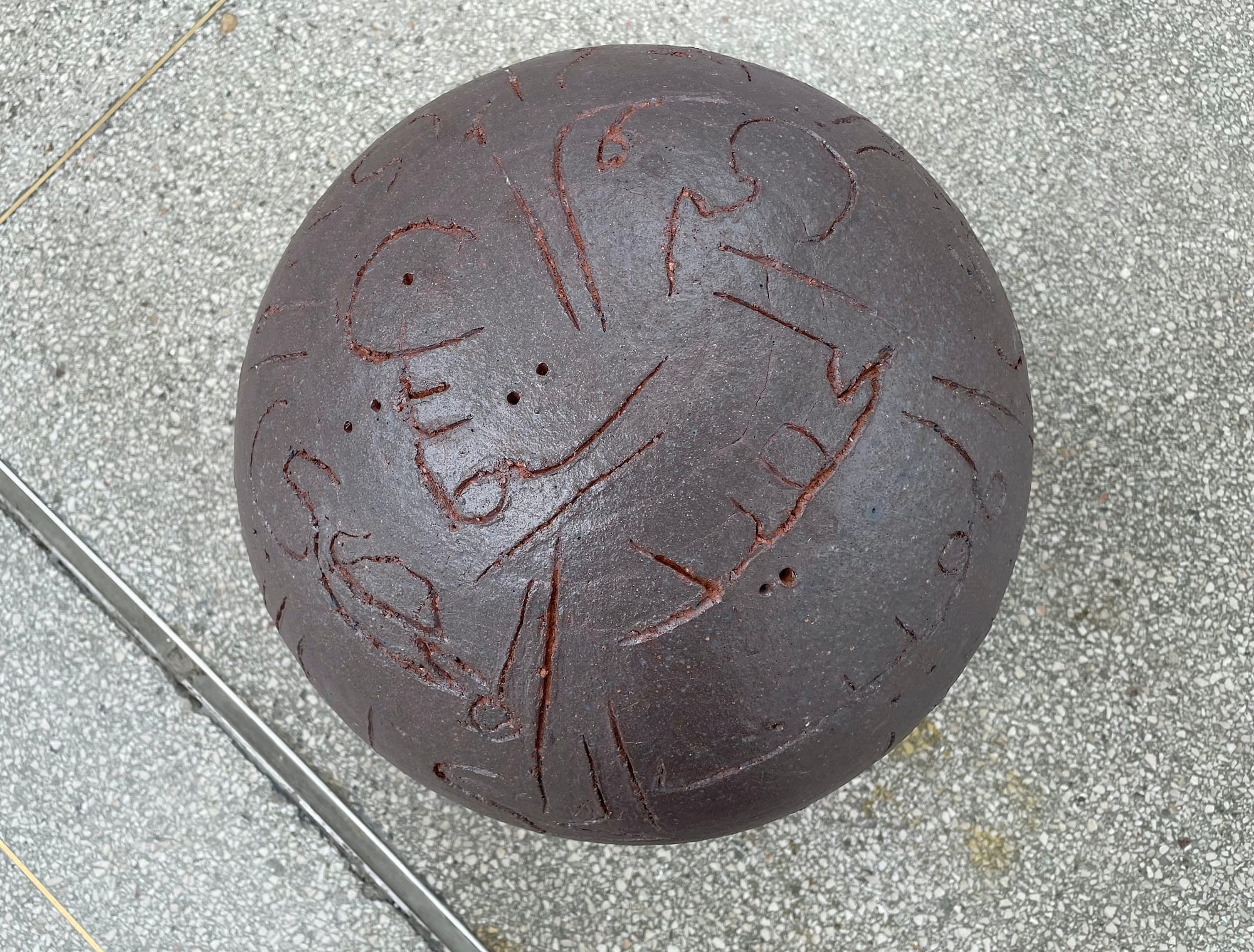 In metaphorS, a major exhibition of Fattal’s work currently on view at the Secession, balls of fired clay are engraved in Arabic with the names of Allah (“The 99 Names,” 2020), anchoring a conversation among mostly recent works. Roughly the size of soccer balls, the six pieces invoking the names of the divine are placed on the floor at a distance from, yet in direct relation to, the five standing humanoid figures of the Guerrier series (Warrior, 2008), also of fired clay. It’s as though they were poised in an ancient game between mortal life and a heavenly power that can be “Beneficent” and “Most Merciful,” as two of the orbs read — but also “The Bringer of Death” and “The Destroyer.”