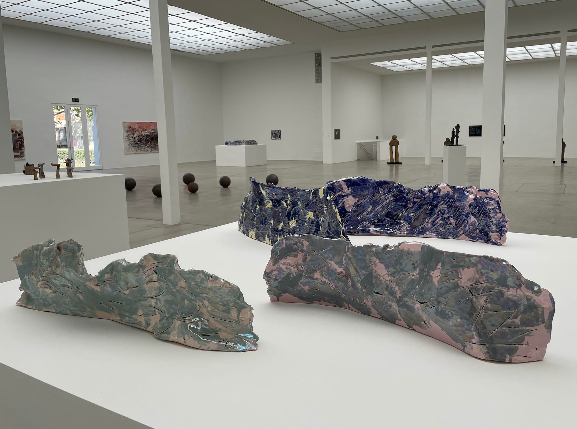 Some of the show's most beautiful pieces are gleaming ceramic objects in blue, green, and pink hues resembling segments of waves glittering in the sunlight. They introduce an element of lightness and ethereal beauty, of the fragility of the passing moment and the inevitability of eternal change. Fattal has titled them Clouds (Faenza) (2023), adding a message of joyful hope to this pensive exhibition.