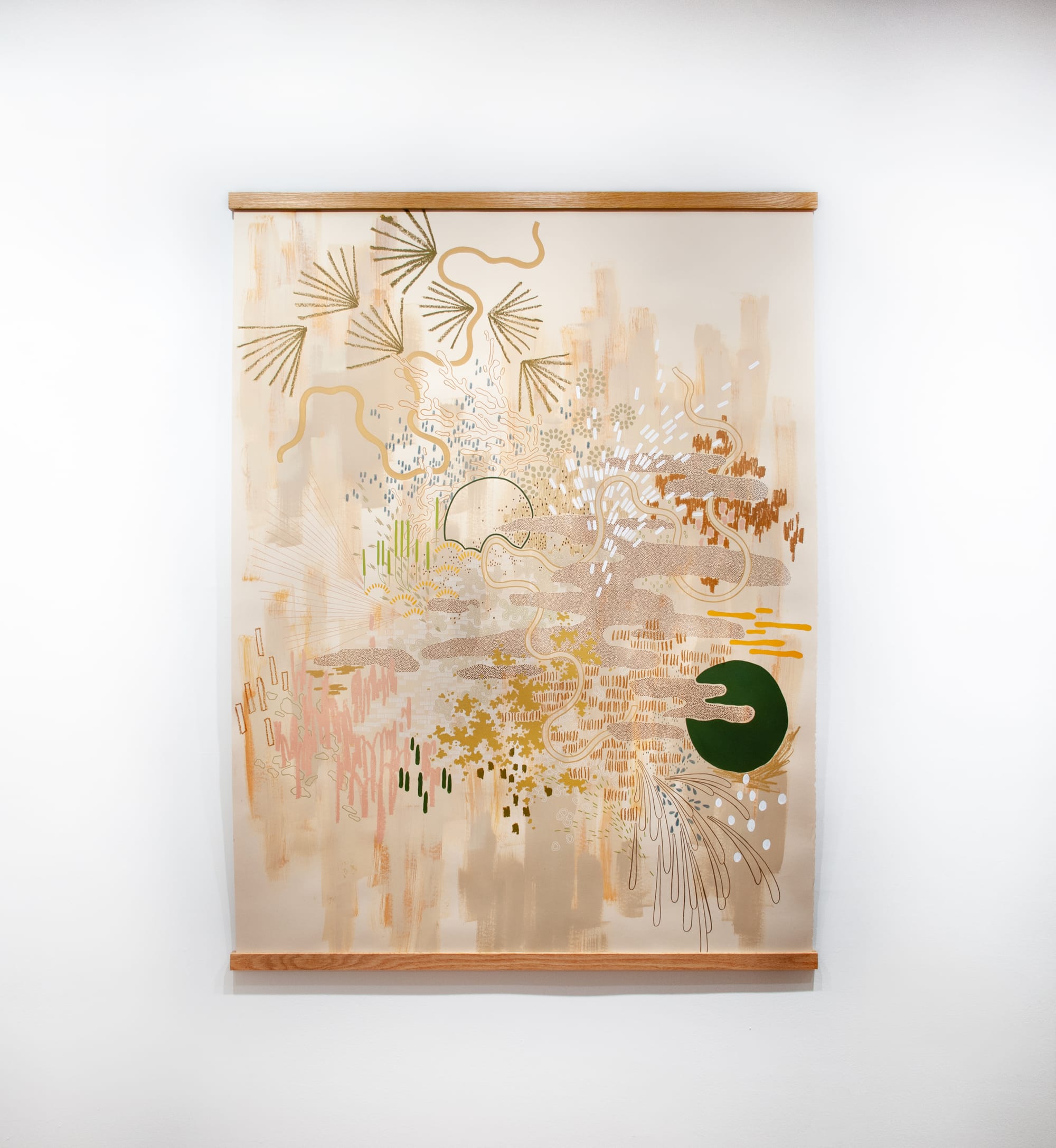 Frances Segismundo is inspired by aerial landscape photographs to explore more complex realms of physical and psychological states in her painting practice. Memor at Distortion Society in Beacon presents a series of multi-layered works on paper that combine acrylic, oil pastel, colored pencil, and pen to create whimsical environments that recall classical Chinese paintings and mid-century modern aesthetics alike. In works such as “Undergrowth” (all works 2024) and “Beneath the Surface,” Segismundo orchestrates a cacophony of flowing organic shapes and loose floral designs, a solid-colored disk that anchors the otherwise floating-world ambiance of these cosmic compositions. Segismundo’s exploration of the “Zen methodology of balance, concentration, and movement,” as the press release puts it, culminates in “Qualia,” where the ochre sun in the middle of the piece nurtures the fanciful shapes that dance and burst all around it.