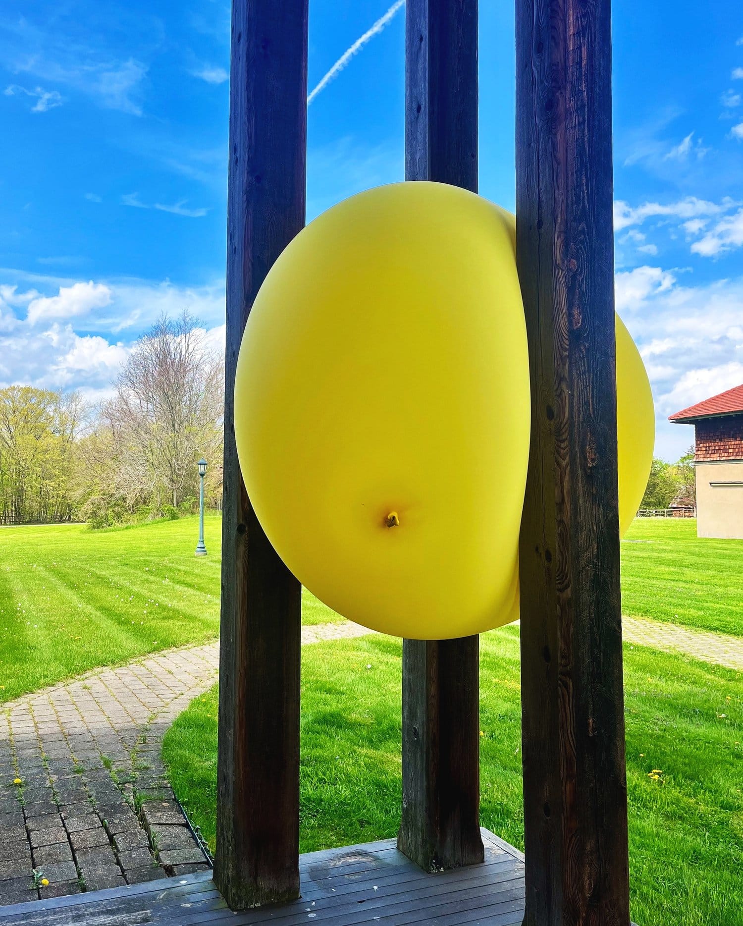 The Kaatsbaan Cultural Park in Tivoli provides an inspiring natural environment for its robust arts program, which includes artist residencies, educational programs, seasonal events, and annual outdoor festivals, spanning disciplines as diverse as dance, theater, music, film, poetry, and culinary and visual arts. This year’s iteration of their annual visual arts exhibition, curated by Hilary Greene, presents the work of eight Hudson Valley artists installed around the Kaatsbaan’s pastoral property along the Hudson River. Visitors wandering the sprawling grounds will encounter diverse pieces nestled into the landscape, such as Emil Alzamora’s “Polaris” (2023), a cement sculpture of a figure in a sacred yogic pose honoring the earth, and Sequoyah Aono’s stoic wood sculpture “Self Head 2” (2023), which appears to be deep in thought, on the brink of opening its eyes to speak with us. Ashley Lyon’s “Meteor” (2020) is a large white stoneware foot severed from its body yet inching forward, while Arthur Gibbons’s “Kaatsbaalloon #1” (2024), a large yellow weather balloon tucked in between a set of vertical wood beams, solicits glee.