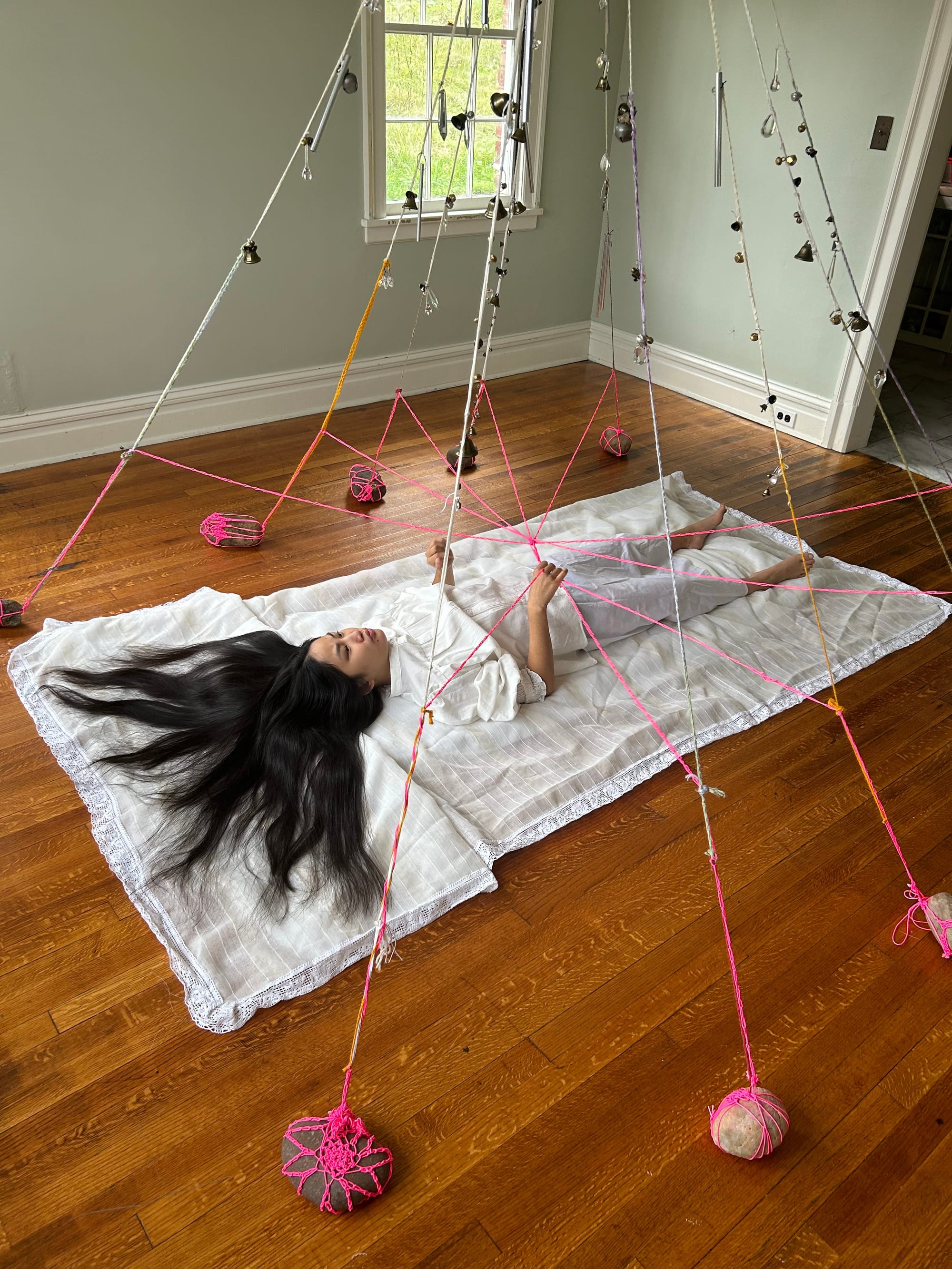 Pairing sculptures with a performative installation, PULSE: Dan Devine and Susan Jennings at Tanja Grunert Gallery in Hudson explores the potential of material spaces to transcend our lived realities. Devine’s “Nimbus” (all works 2024), made of molded leather and raw lamb’s wool, appears to twist into itself, while the smooth ceramic “Stride” stands stoic and upright in its raw red power. Jennings’s work is a ritualistic orchestration of materials that embodies her experiences with death, as witnessed during her years as a professional nurse. Employing diverse materials including bells, thread, wire, chimes, stones, porcelain, and a mattress, and activated by Faye Ross's live performance, Jennings’s “Out of Body” feels like a sacred space to contemplate our inevitable transformation from this material plane to the next unknown.