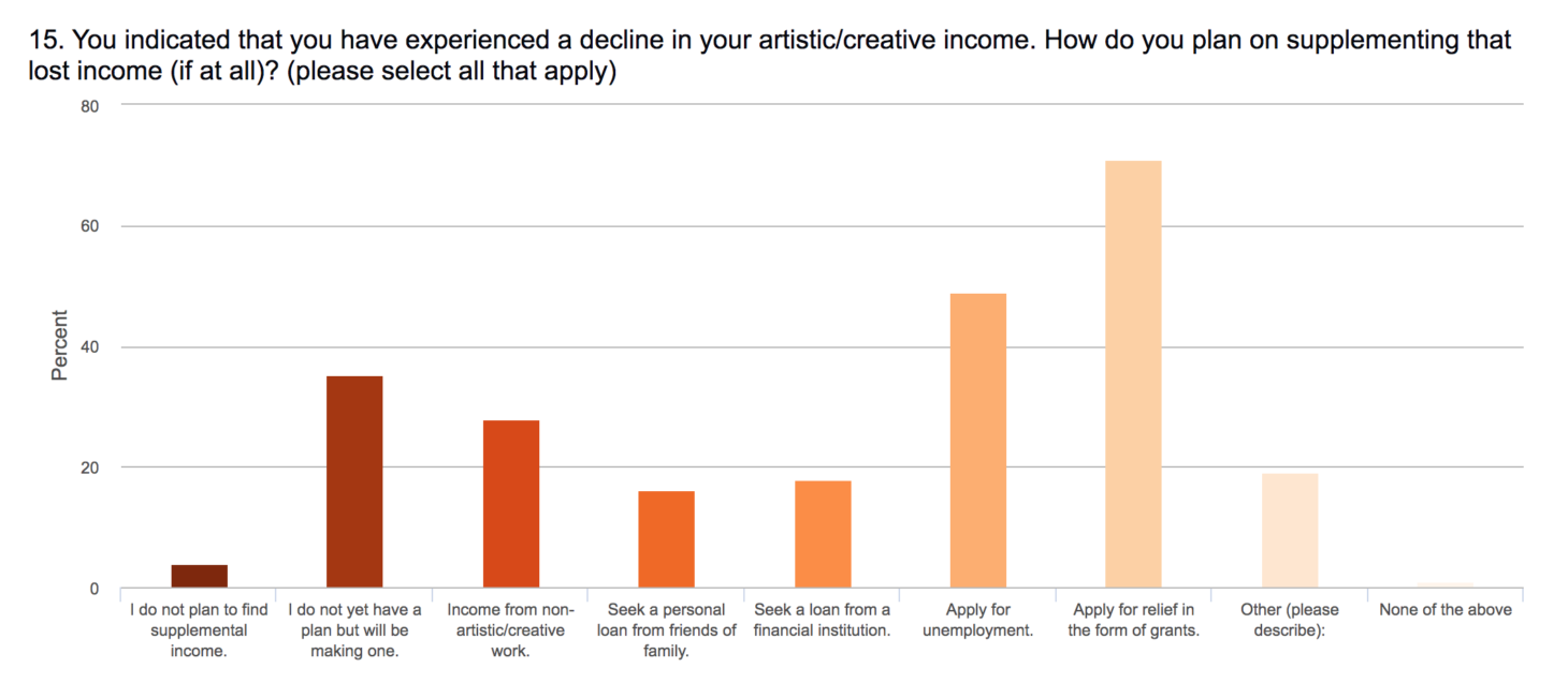 An overwhelming 95% of artists have lost income due to the crisis, with an average decline in estimated total annual income of $27,103. A further 66% of survey respondents said they cannot access the resources they need to continue their creative practice, including supplies, physical space, and social networks.