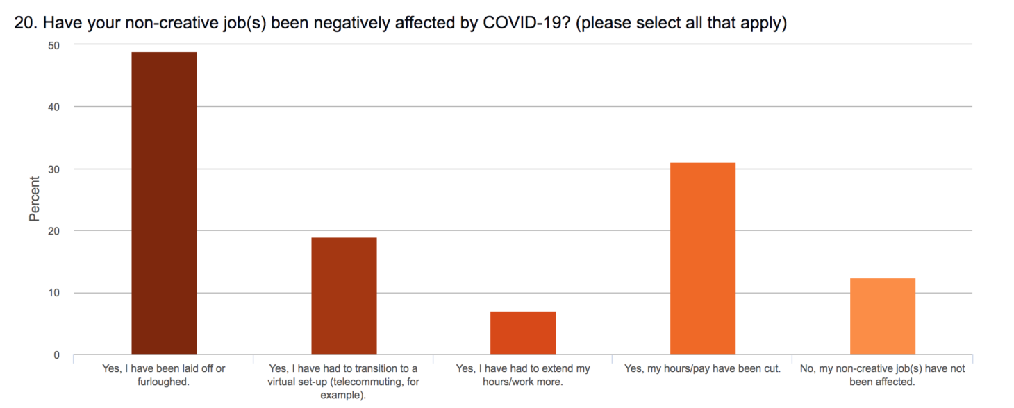 “With a creative workforce that includes so many entrepreneurs, independent contractors, and gig workers, we knew that COVID-related closures were going to hit creatives hard, but these numbers are shocking,” said Clay Lord, Vice President of Strategic Impact at Americans for the Arts, in an email.