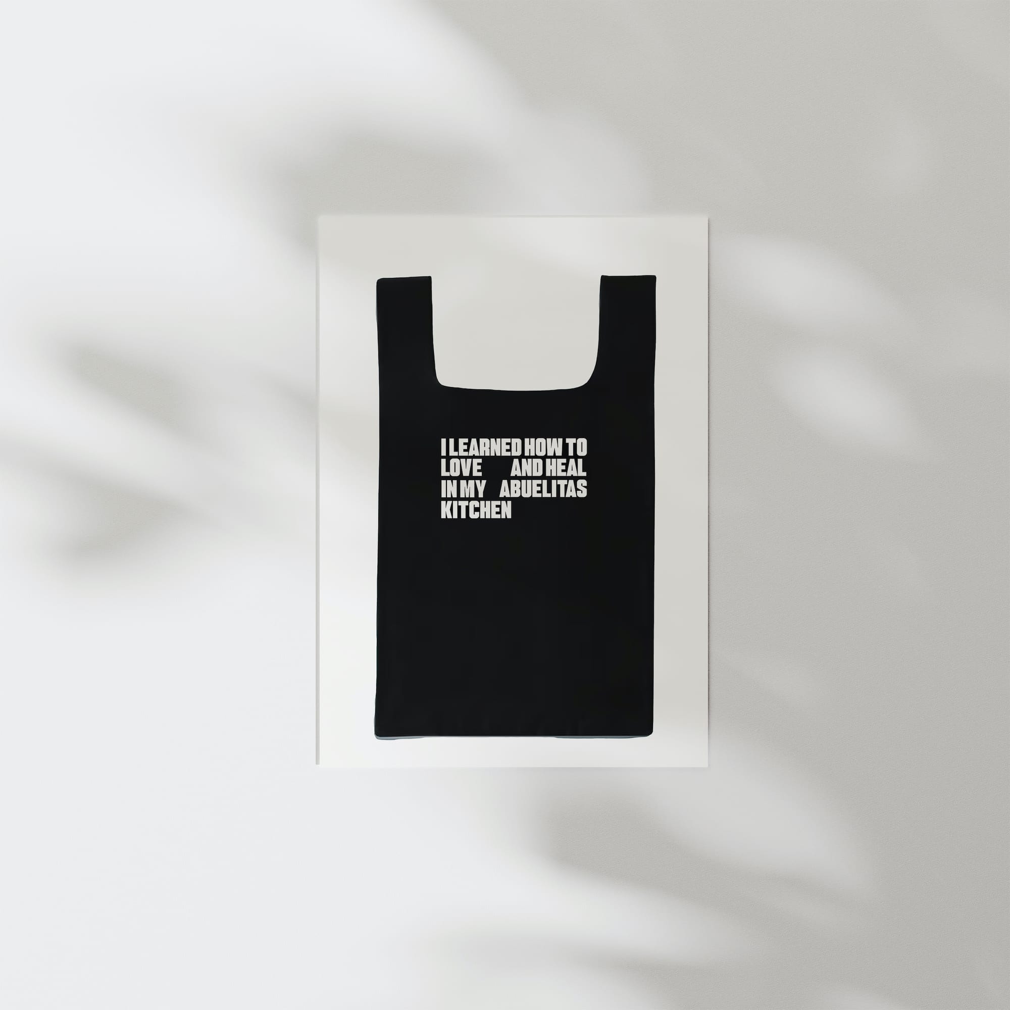 At another booth, Panamanian-American curandero and visual artist Nicoletta Daríta de la Brown will show their work including one black print reading only “I learned how to love and heal in my abuelita’s kitchen” in all capital white letters.