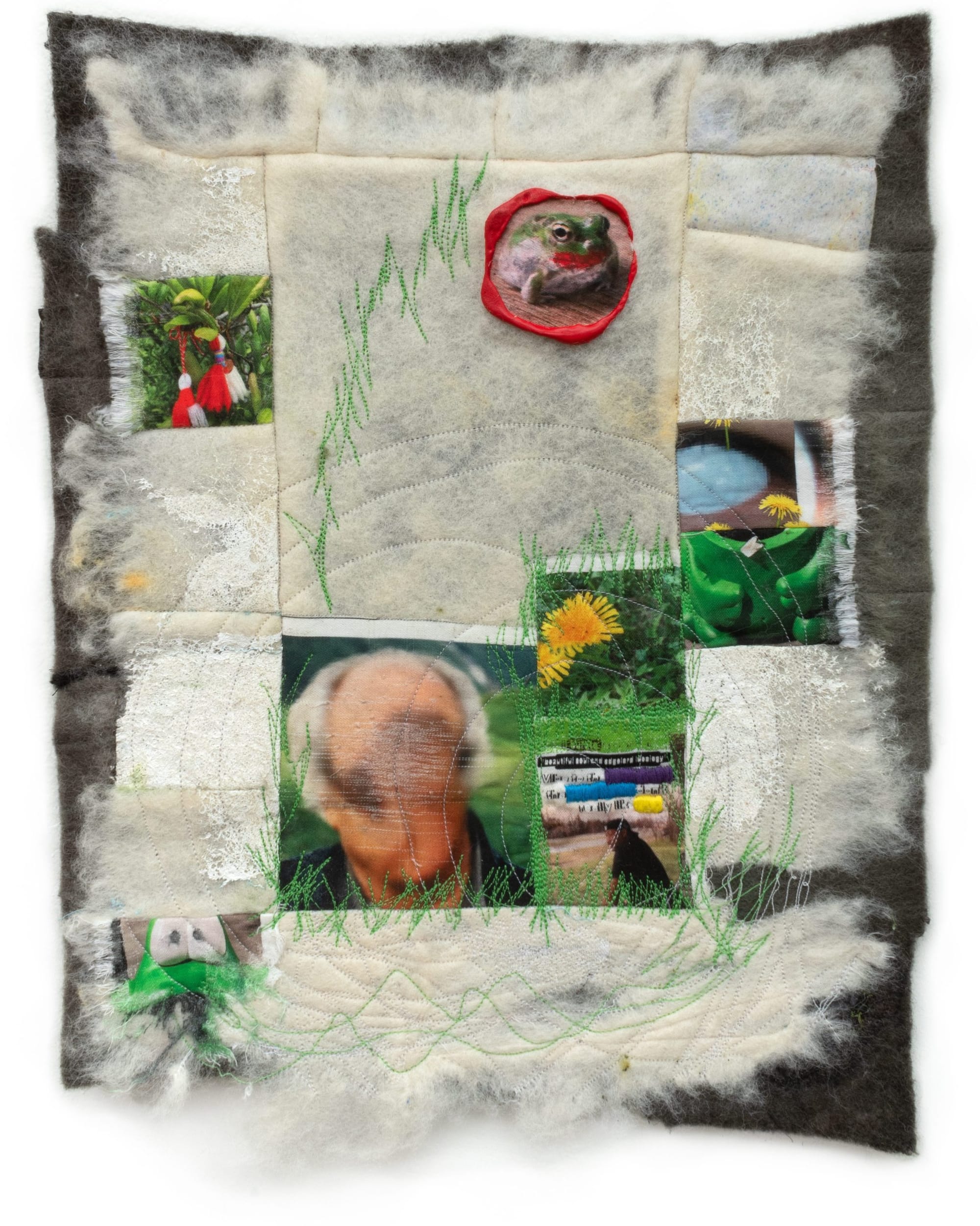 John DeSousa’s style is anthropological-meets-crafty: He combines a digital archive of personal photos with content generated by artificial intelligence and overlays the resulting imagery onto various fabrics. His first solo show includes a series of recent fabric collages and quilts. Some of these works feel fragmented and distorted, such as “Frog Kiss” (2023), a collaged piece that includes a balding man, yellow flowers, and a large toad with red lips. “to String is forbidden” (2024) is among the most compelling of DeSousa’s detailed fabric collages. In it, a border of zebras flanks an amalgamation of random images including a sitting couple, a mother and baby deer, and grassy woods.