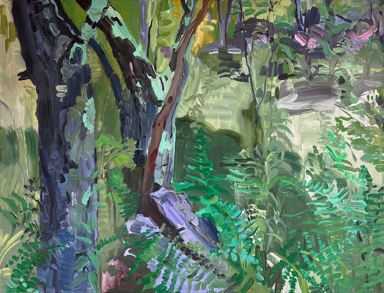 Plant Matter at Roxbury Arts Center extols the multitudes of meaning offered by Mother Nature. The 20 artists in this show explore the complexities of biomaterial, invasive plants, and the effects of climate change through mixed media and found material, as well as one sound piece. Margot Glass’s acrylic-on-paper “Wild Geranium 1” (2022) is dramatic and moody in true Halloween fashion, while Amy Wilson’s “Everything that is living is part of us...” (2024) embodies the theme with a magical scene of two figures amid a thriving wood. Other highlights are Kamilla Talbot’s lush oil painting “Ferns and Things” (2023), which is a pleasant peek into an isolated verdant corner of the planet; Gerda Van Leeuwen’s “Berries” (2024), a gorgeous monoprint in richly macabre tones; and Susan Weisend’s trompe-l’oeil paper, clay, and paint hanging sculpture “Symbiosis: Lichen” (2021), whose happy mushrooms attached to a tree leave a smile on one’s face.