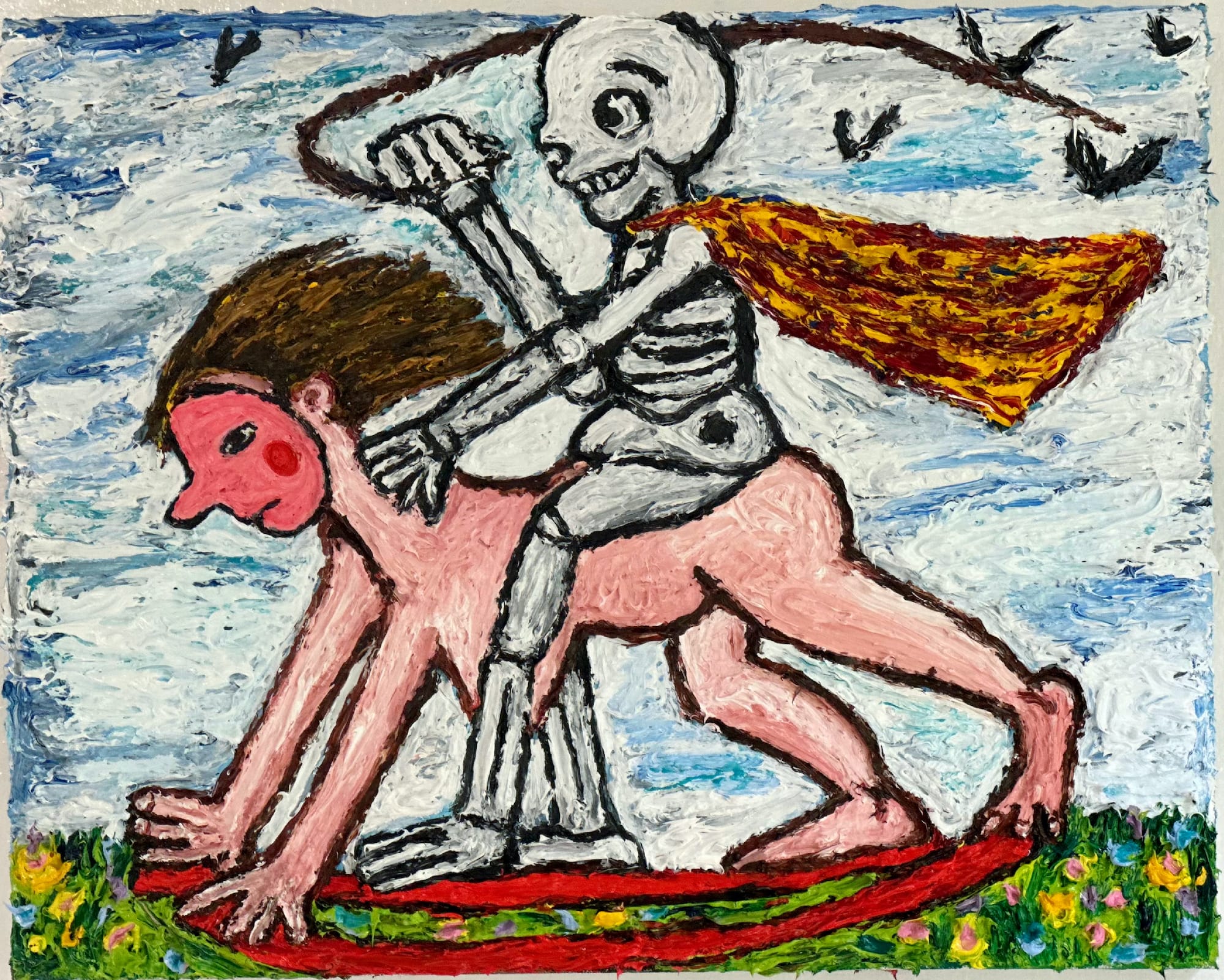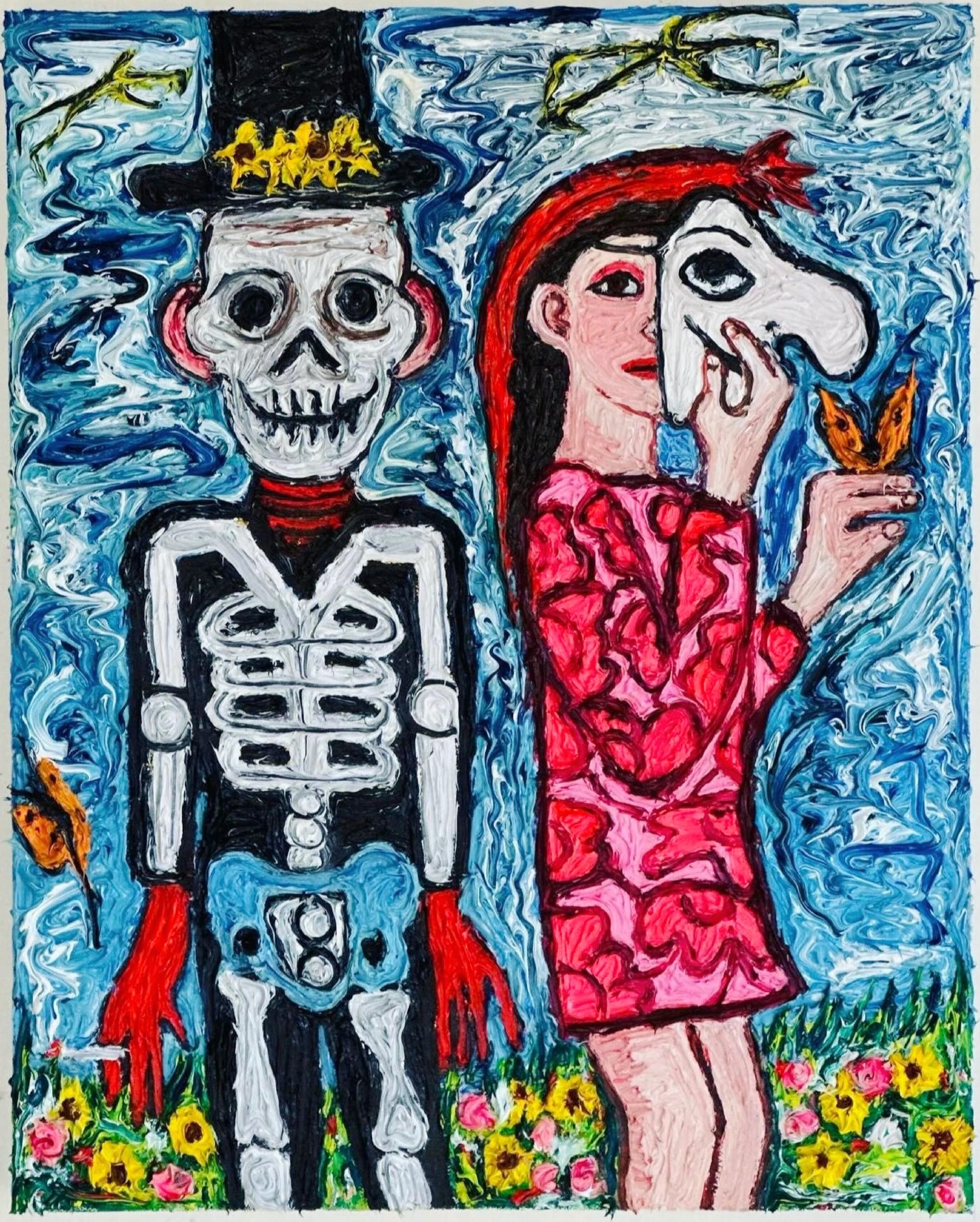 The celebratory and silly mood of Susan Carr’s paintings kindles the heart and stirs the soul. This month, LABspace in Hillsdale presents paintings, sculpture, and ceramic works in her sixth solo show with the gallery. “Flowers” (all works 2024) is pleasantly poised, while “Keeper of the Bees” suggests a feeling of loving kindness: A woman in a flowery red top gazes, cross-eyed, at the bumble bee resting peacefully on her nose — the scene is serene, with no feeling of possible threat. Other works feel distinctly Halloween-inspired: “Travelers” features a couple in costume — he in a black top hat and skeleton suit, she in a red dress and white mask — while a smiling skeleton flails a whip astride a masked naked woman in the gleeful “Plaything."