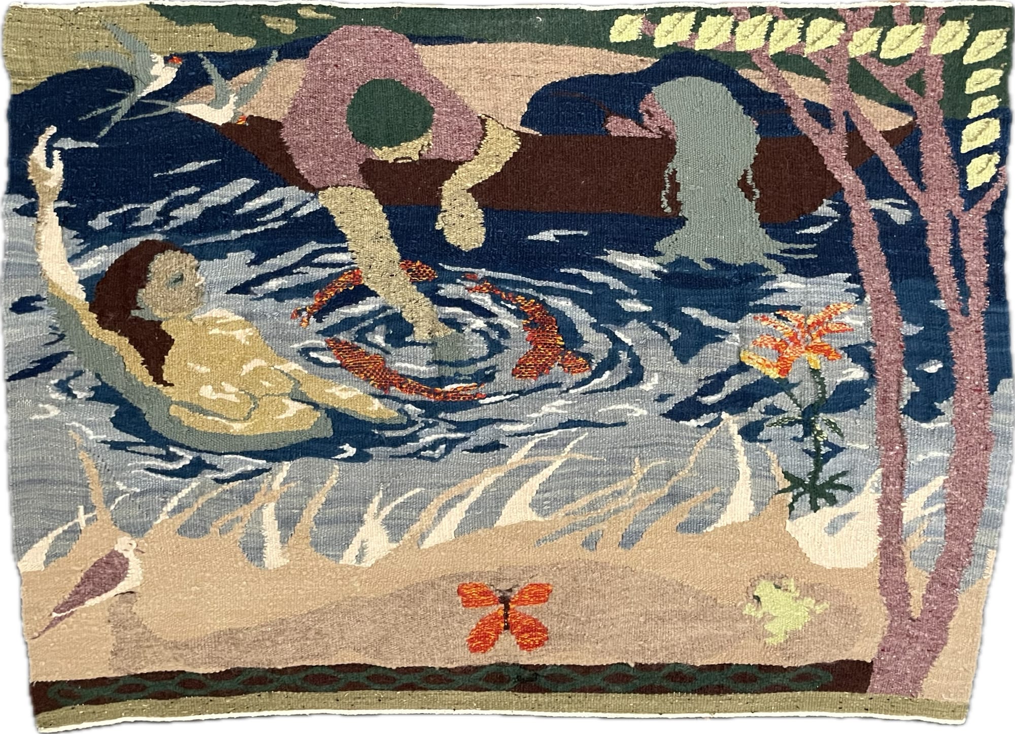 The Ruffed Grouse Gallery in Narrowsburg brings together the work of Tali Burry-Schnepp, Henry Murphy, and Bethann Parker for the first time in Field Notes. A painter, printer and self-taught weaver, Burry-Schnepp explores memory in a series of works that highlight natural scenes among humans and animals. “Dreamers” (2023), for instance, consists of acid and vegetable dyes and wool with acrylic on cotton, and features a naked woman half-submerged in water while a figure in a boat reaches down toward a trio of koi fish in that water. Murphy cites direct observation, classical landscape traditions, and folk art as primary influences on his practice. Those inspirations are clearly seen in the pleasing painting “Chess Players” (2024) in which a group of abstract figures spread out among yellow tables and chairs play the titular game in a half-urban, half-suburban setting. A series of thickly painted works by Parker, who embraces spirituality and intuition to tease out rural narratives in layered landscapes, rounds out the show. “Split Rails and Burning Bridges” (2022), which features a red barn caught in flames against a hazy and seemingly unfinished background, induces a jolt of raw emotion that awakens something within us.