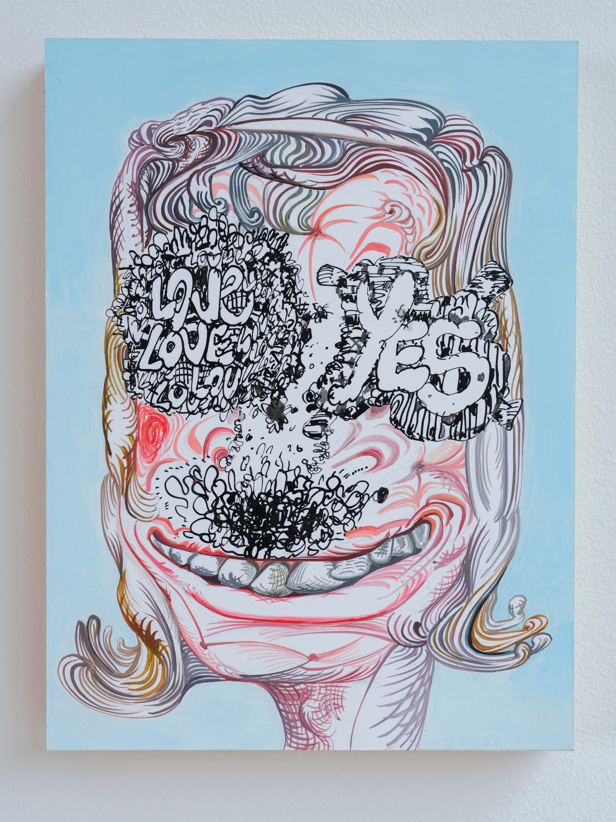 At Catskill Art Space in Livingston Manor, the work of James Esber, Jane Fine, Tracey Goodman, and Jim Lee alternate between speaking together and individually. Jim Lee’s sensibility, for instance, comes through in the austere, Zen-like grace of “Untitled (CO|HO No.8 – Night Spots)” (2024). And Tracy Goodman's idiosyncratic vision comes through in the sprawling installation “Choose any hour on the clock” (2023–24), which features objects, including clocks, dyed New York Times newspapers, and a chrome-cast sculpture of the Virgin Mary, on the floor and crawling up the wall. A series of drawings by J. Fiber — a pseudonym for James Esber and Jane Fine — toggle between abstraction and figuration in works such as “Yes, Love” (2021), in which text such as “love” and “yes” make up the oversized eyeballs to a strangely wonderful head. That work combines elements of their individual practices; Fine’s “In Fine Spirits” (2023), for instance, includes her initials in giant green letters amid a hallucinogenic landscape, while Esber’s “Sleeper” (2021) is a bloated heap of color that melts into itself.