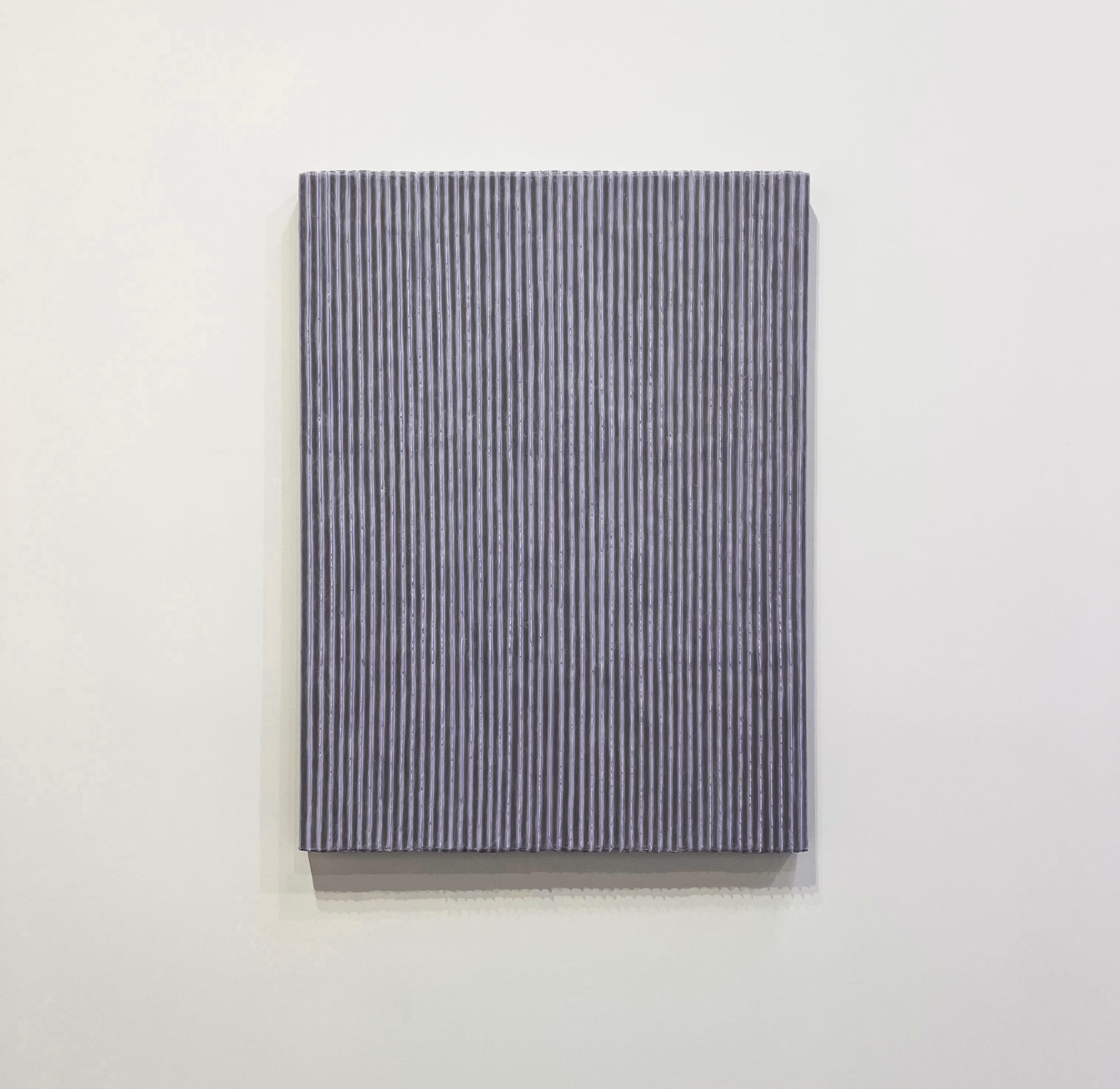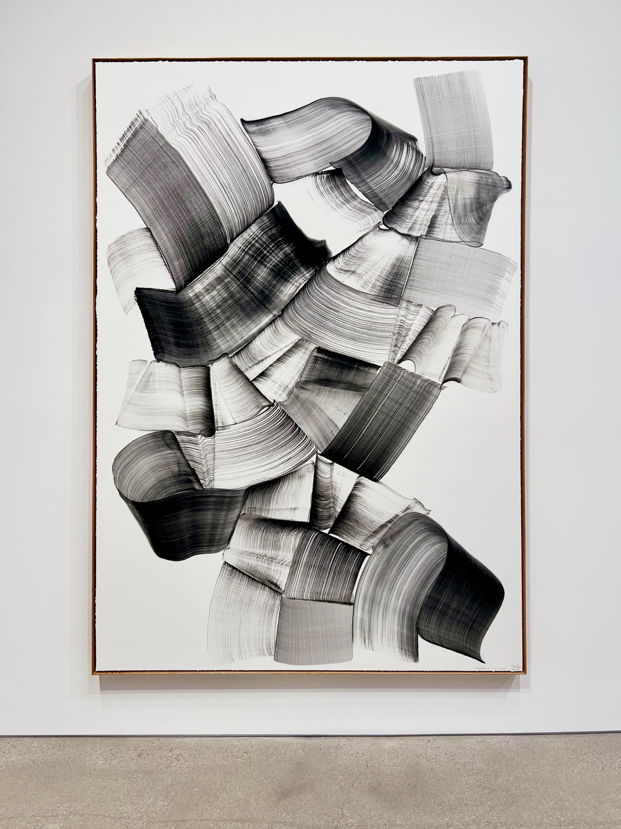 For his signature Écriture series, Park Seo-bo, one of the founding members of Dansaekwha, drew consecutive lines on traditional hanji paper, entering a meditative state in the process that counteracted the otherwise emotional turbulence of his divided nation. Standing over a paper placed horizontally, second-generation Dansaekhwa artist Lee Bae evokes the body with “Brushstroke-38” (2024) by sweeping a single definitive mark of handmade charcoal ink with a large calligraphy brush. Shim Moon-Seup’s “The Presentation” (2015) diverges from his previous sculptural background, referencing breaking waves and Lee Ufan in his painting. The most contemporary of this group — and the only Korean American artist — is Los Angeles-based Yunhee Min, whose Small (2023) series experiments with how paint performs when applied to canvas in unconventional ways.