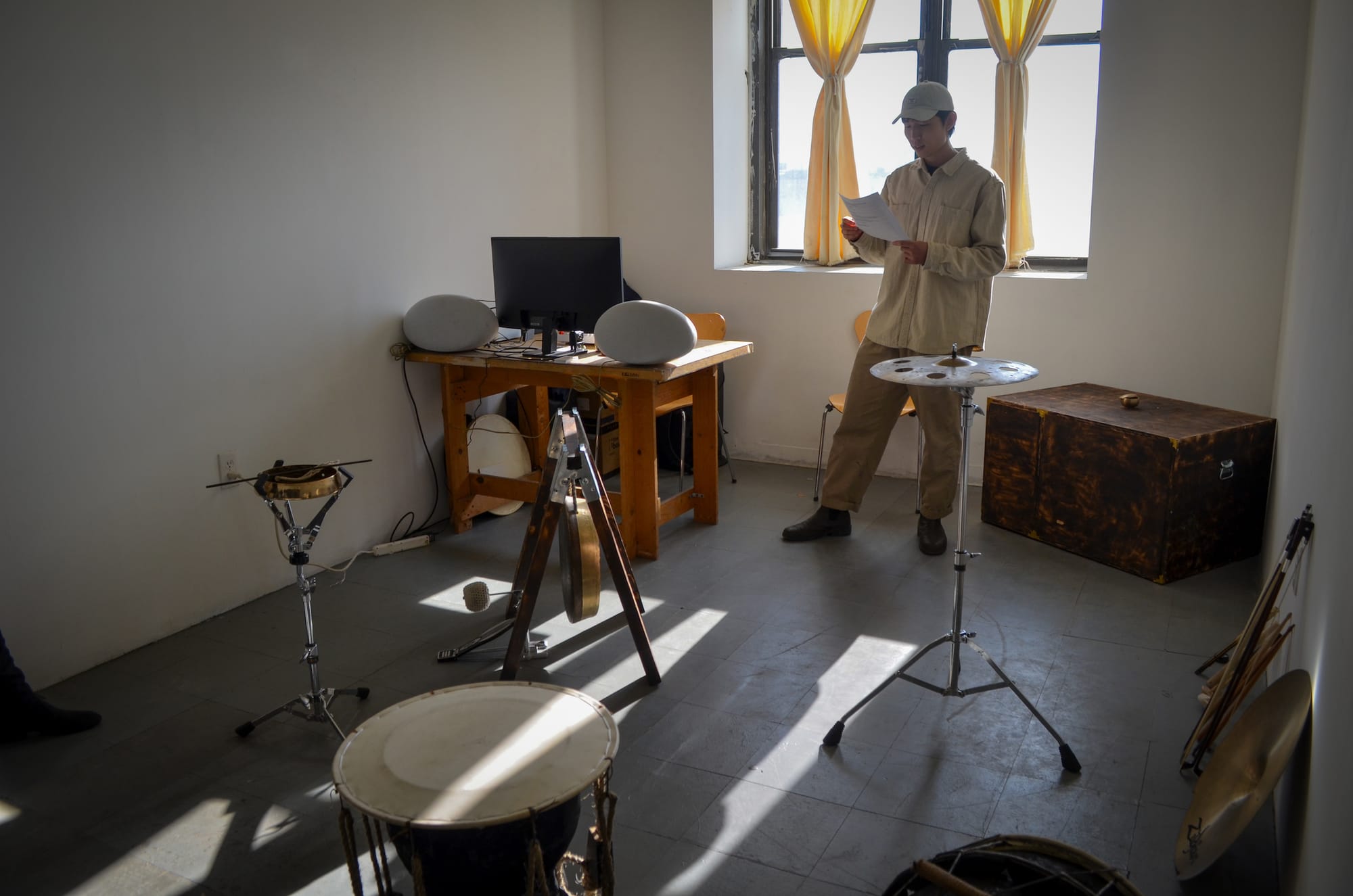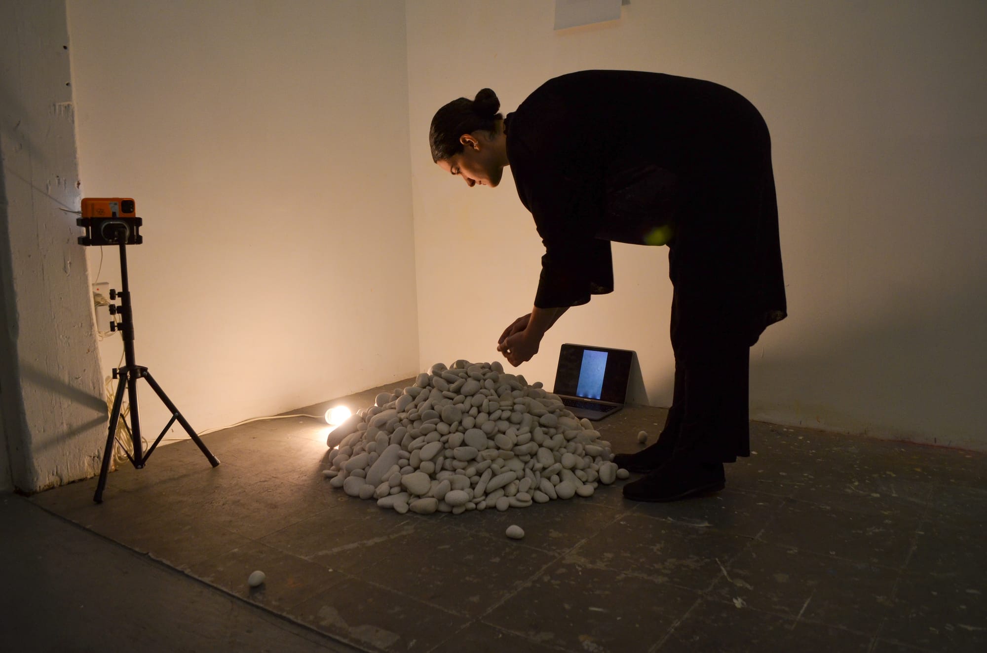 At the NARS headquarters, 13 resident artists displayed their works and Curatorial Fellow Dylan Seh-Jin Kim organized a collaborative performance series fittingly titled 3 Studios. In one performance, “Walking, Waiting, Writing, With Rocks,” Greek artist Lafina Eptaminitaki moved a pile of 1,410 Caribbean beach pebbles, one by one, across an empty studio space. Eptaminitaki told Hyperallergic the piece was to unfold across the three days and explore “time, labor, and the relationship between displacement and discourse through material and movement.”