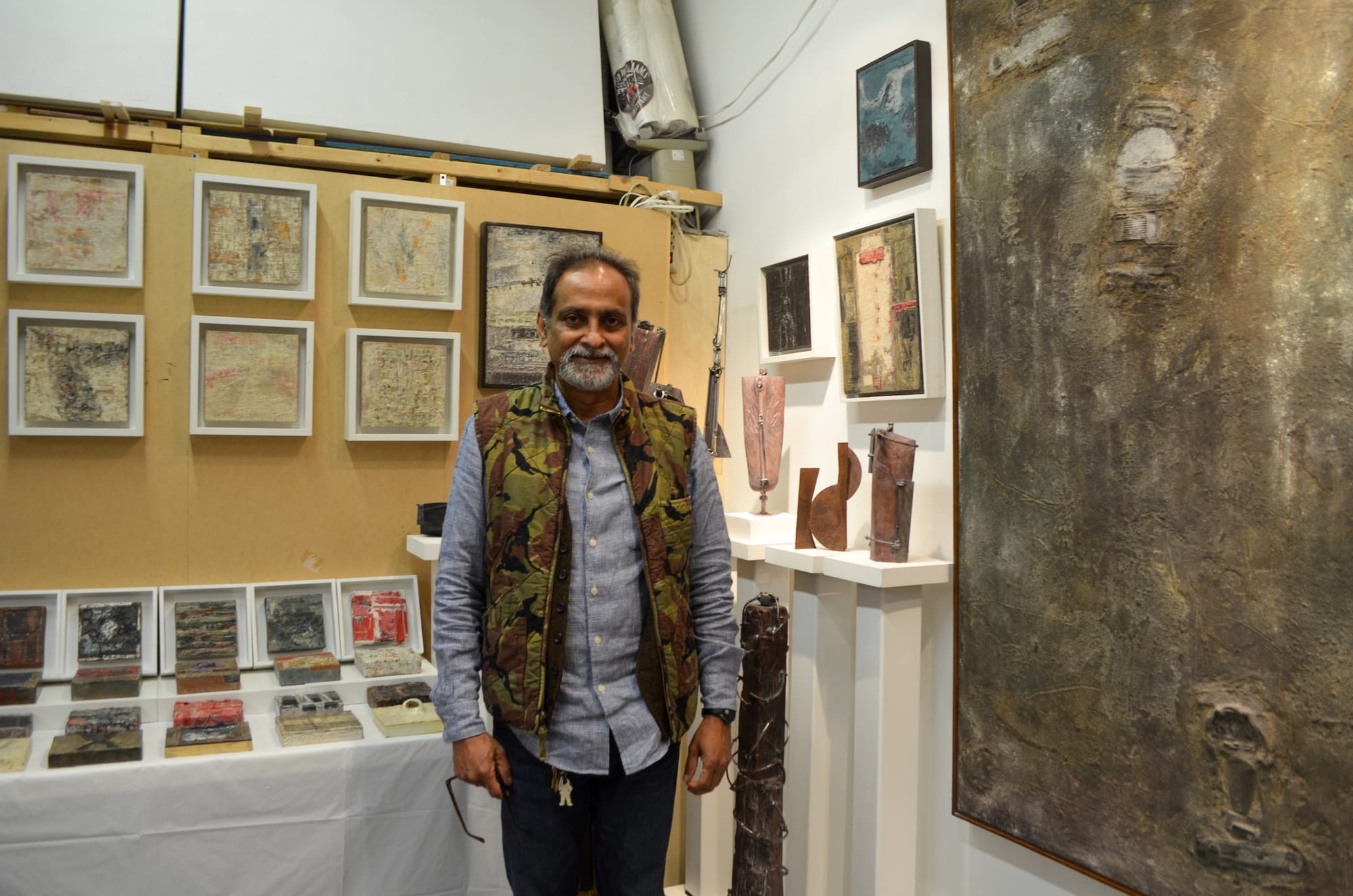 Artist Niamul Bari, who rents a space from the nearby J&M Studios, chronicles his emotions in wax and thick oil paintings with marble, sawdust, and pigment. One of the works in his studio, he said, incorporates Bangladeshi architecture with the textures of New York City streets. Having trained in ceramics in his home country of Bangladesh, in sculpture in India, and in painting in the United States, Bari leaves his multimedia works untitled to avoid forcing viewers into a particular interpretation.