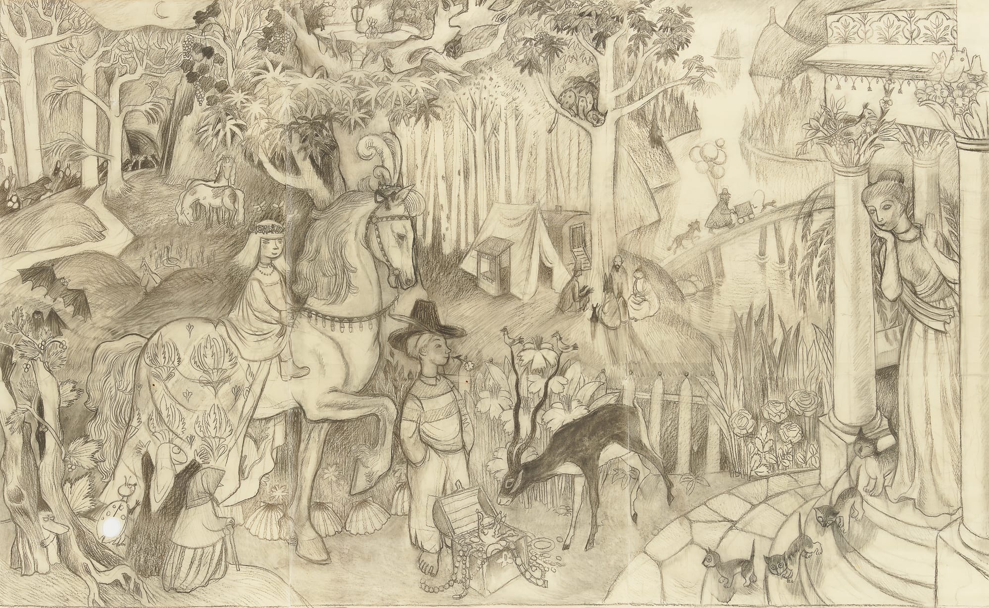 Moomin characters feature more frequently in works designed explicitly for children’s spaces, such as her diptych “Fairytale Panorama,” produced for a kindergarten in 1949. The two paintings are delightful flights of fancy, crammed with whimsical details of princesses, magical landscapes, and fantastical creatures. But even here, as in all of her paradisal paintings, there are subtle hints of menace: Bats flutter, lightning bolts threaten a storm, and cats stalk hungrily. This is not pure escapism, but an expression of a state in which joy and fear are allowed to coexist.