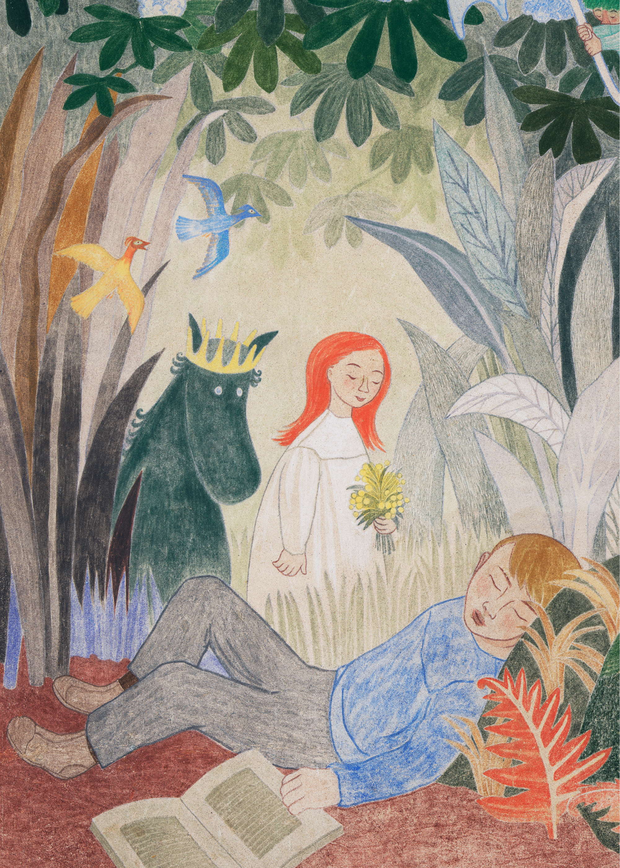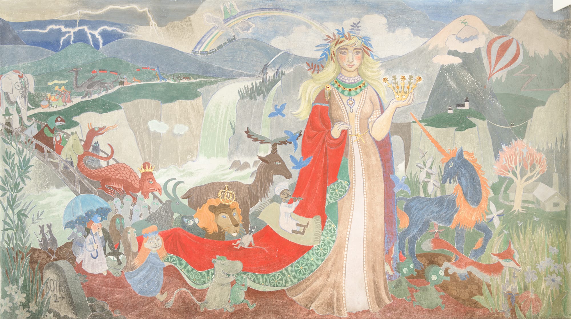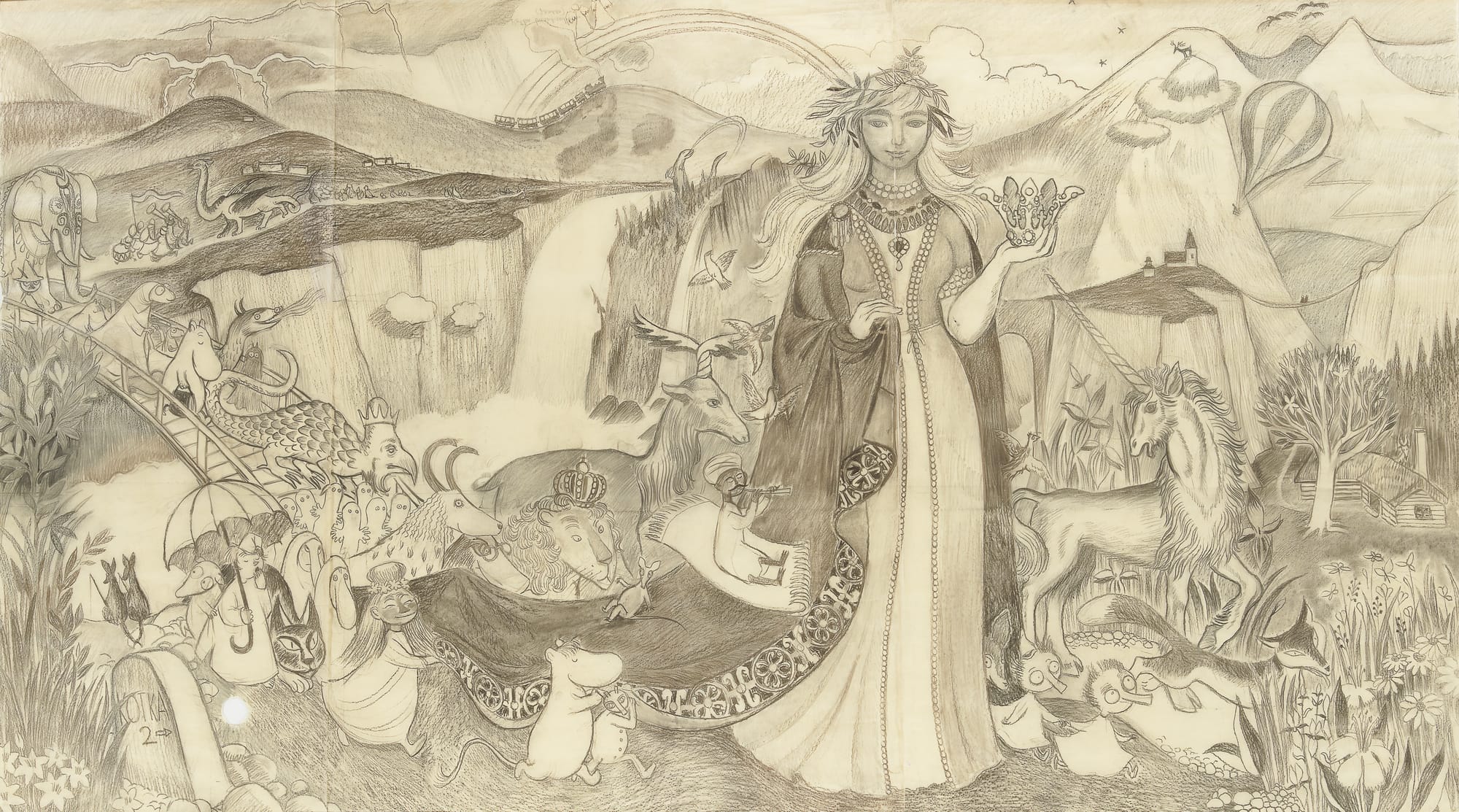 In bombed-out Helsinki and beyond, a government rebuilding program created opportunities for artists, and Jansson was able to earn a living for the first time through her Moomin comic strip and a series of public commissions. In both endeavors, she turned to images of paradise, forests, and fairytales to craft a unique imaginative world that appeals to adults as much as to children.
