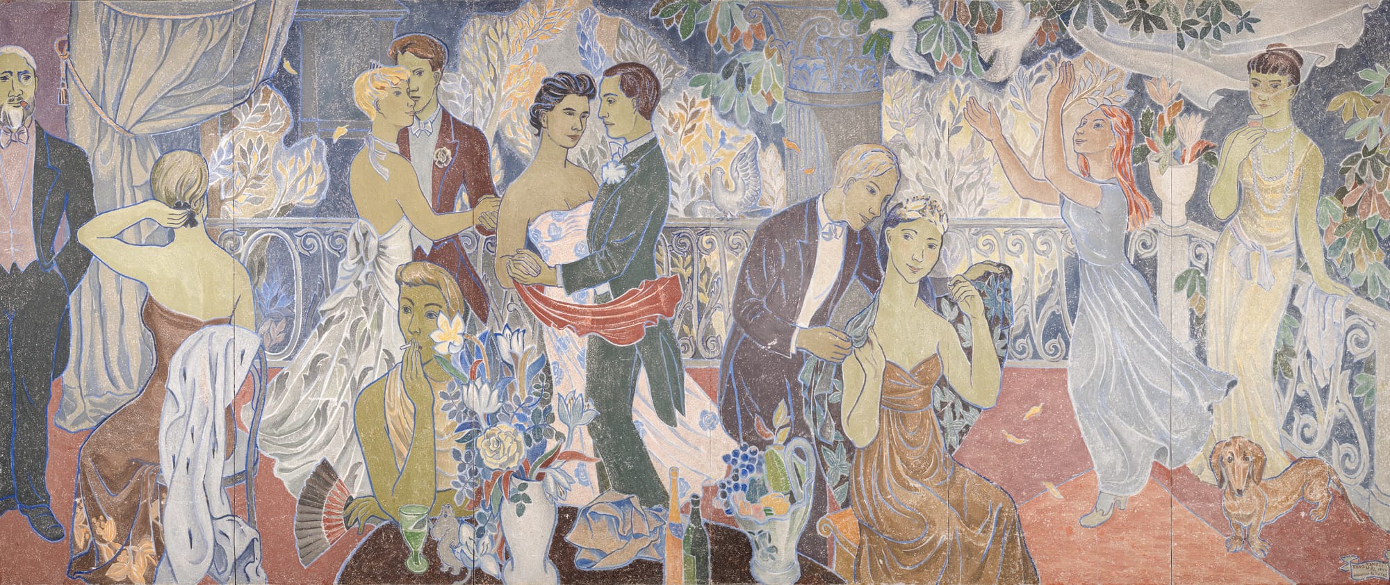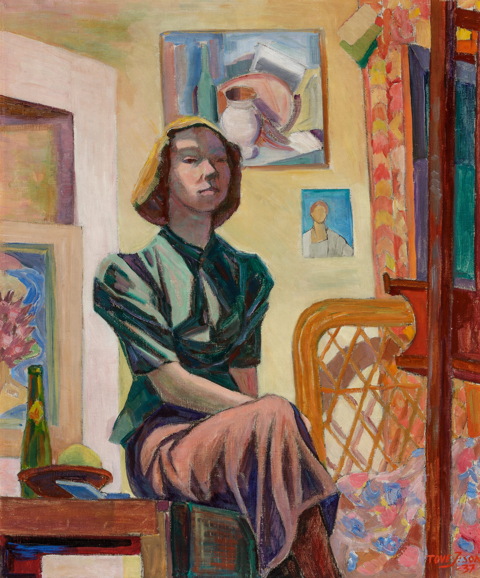 Moomin characters make cameos in many of her murals, such as her frescoes “Party in the City” and “Party in the Countryside” (both 1947). In the first of these, Jansson depicts herself gazing out at the viewer, her back turned defiantly on her lover Vivica Bandler, with whom she had recently broken up with acrimoniously. A little Moomintroll lurks on the table beside her, a mascot, perhaps, that represents a gateway to a more fantastical world.