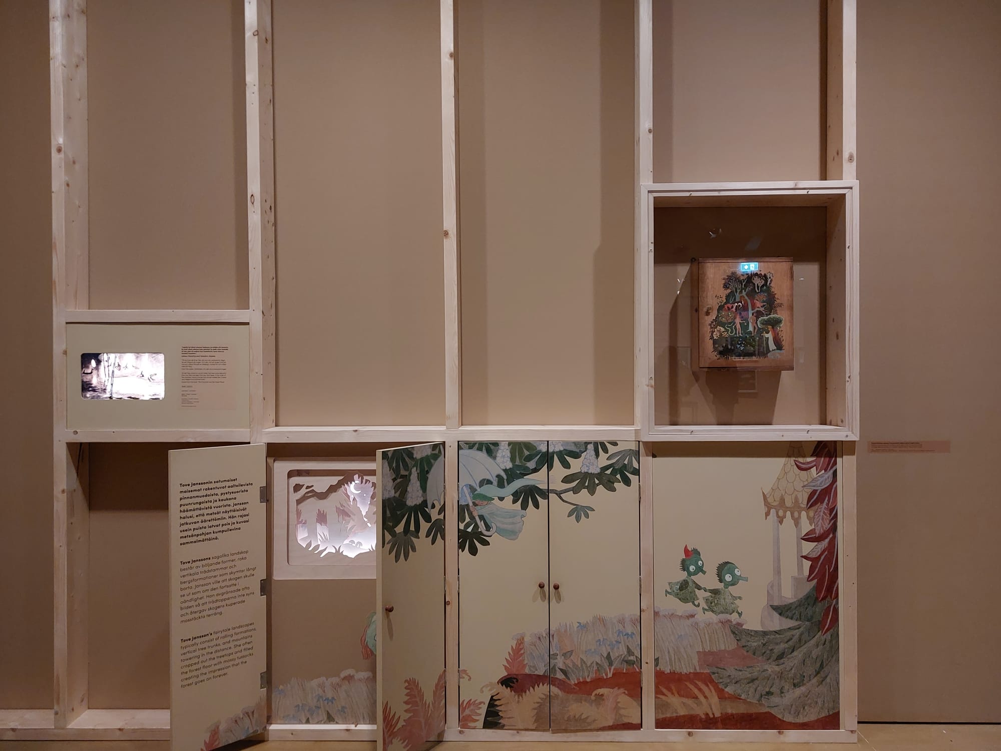 Jansson’s cross-disciplinary oeuvre demonstrates a radical commitment to the profound necessity of play, dreams, and escapism. She took children seriously, which is reflected in the exhibition’s thoughtful, unobtrusive design. Paintings are hung low to the ground, Moomin creatures hide among the architecture, and there are doors to open and kaleidoscopes to look through. The exhibition — infused with the same knowing nostalgia as her works — is both comforting and subtly subversive.