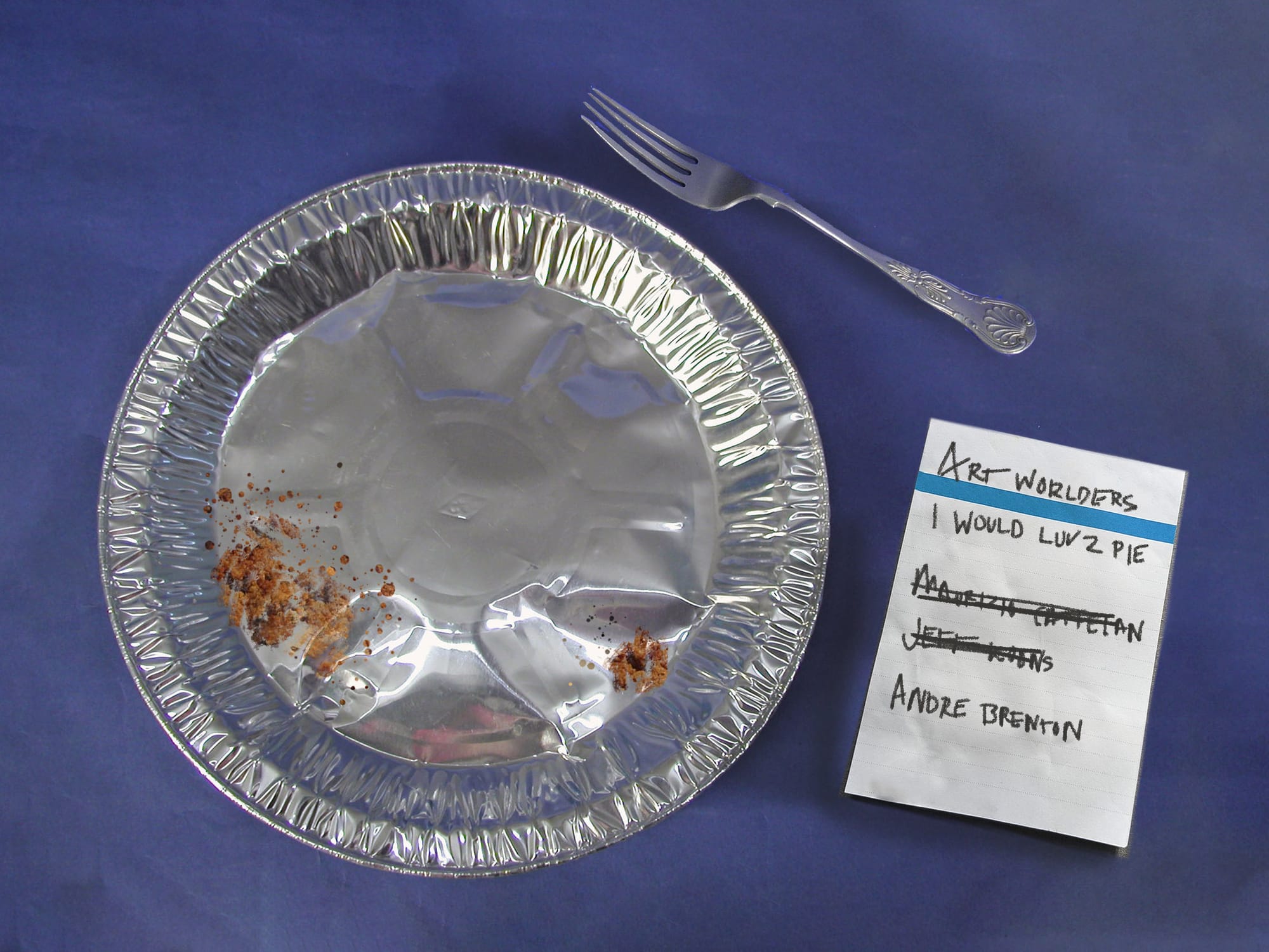 Starting off strong, Marcel presented the judges with a used fork resting beside an empty pie tin littered with crust remnants. “It represents the idea of a pie,” he explained. A nearby note, evidently not part of the presentation, bore the words “ART-WORLDERS I WOULD LUV 2 PIE.” Marcel stuffed it into his pocket once he realized, apologizing profusely. We’ve redacted some of the names for privacy reasons per the artist's request. Overall, a bold presentation, if a bit underdone.
