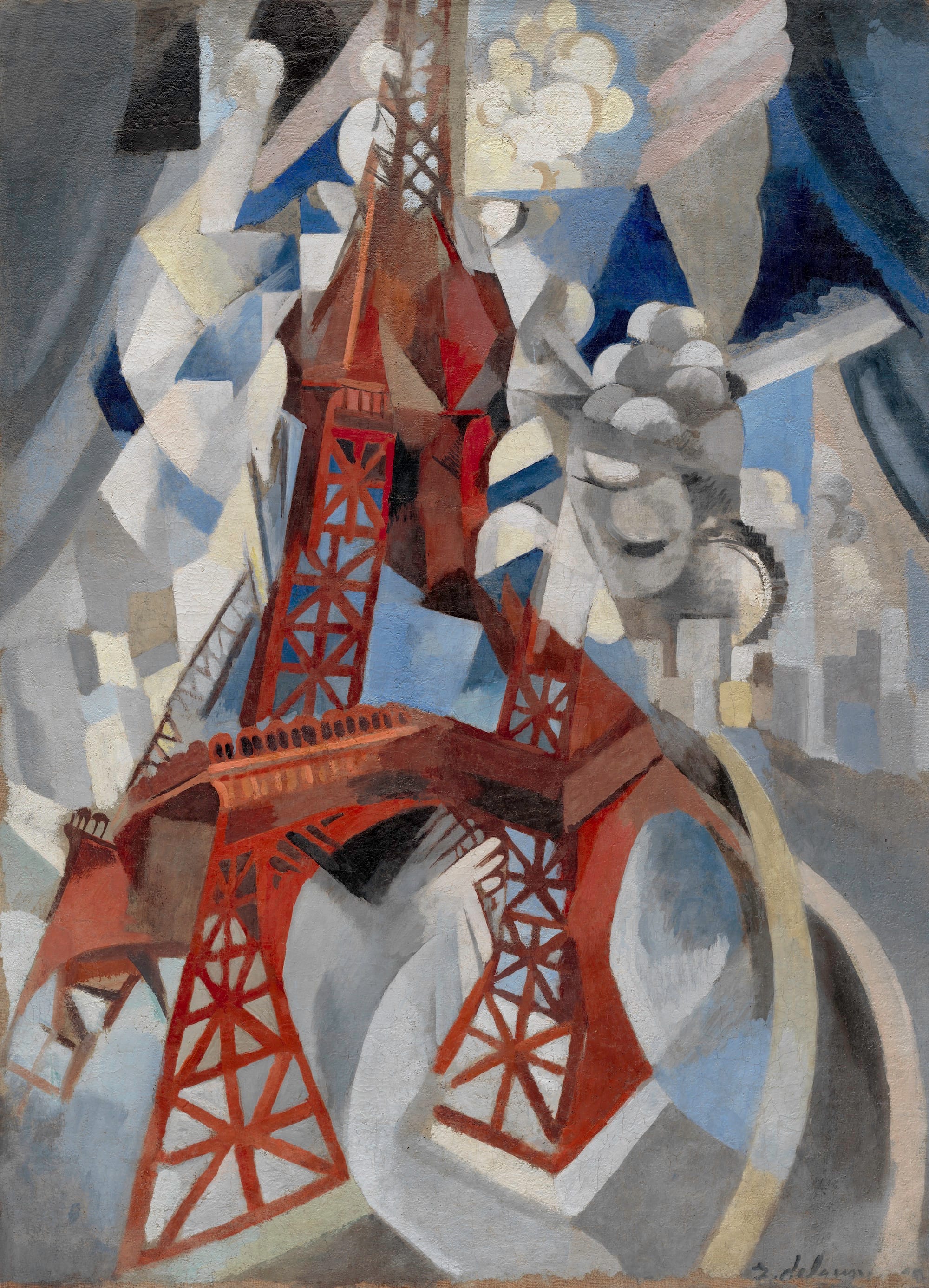 The gallery text that accompanies Léger’s “Les Fumeurs” (1911–12) is typical. It’s a landscape of trees and houses, viewed through the suggestion of a window, framed by the titular smokers and their plumes of cigarette smoke. I was immediately reminded of Georges Braque’s 1908 paintings of L’Estaque, fractured landscapes from multiple perspectives that are considered some of the first Cubist works to be exhibited. But in the interest of advancing Orphism as its own unique style, the curators have made a different comparison, linking it to two Robert Delaunay paintings of the Eiffel Tower also made around 1911. Calling Delaunay’s Eiffel Tower paintings “dynamic” is fine — the landmark is broken into dizzying, clashing shapes and painted in an energetic red — but then dismissing Braque’s Cubist work as “static” feels forced and a little clumsy, especially when Léger’s painting is mostly a fairly quiet, rural, landscape painted years after Braque’s first experiments. Léger and Delaunay’s paintings are still fundamentally figurative: They are beginning to move away from representation, but are still not exactly purely aesthetic pleasures.