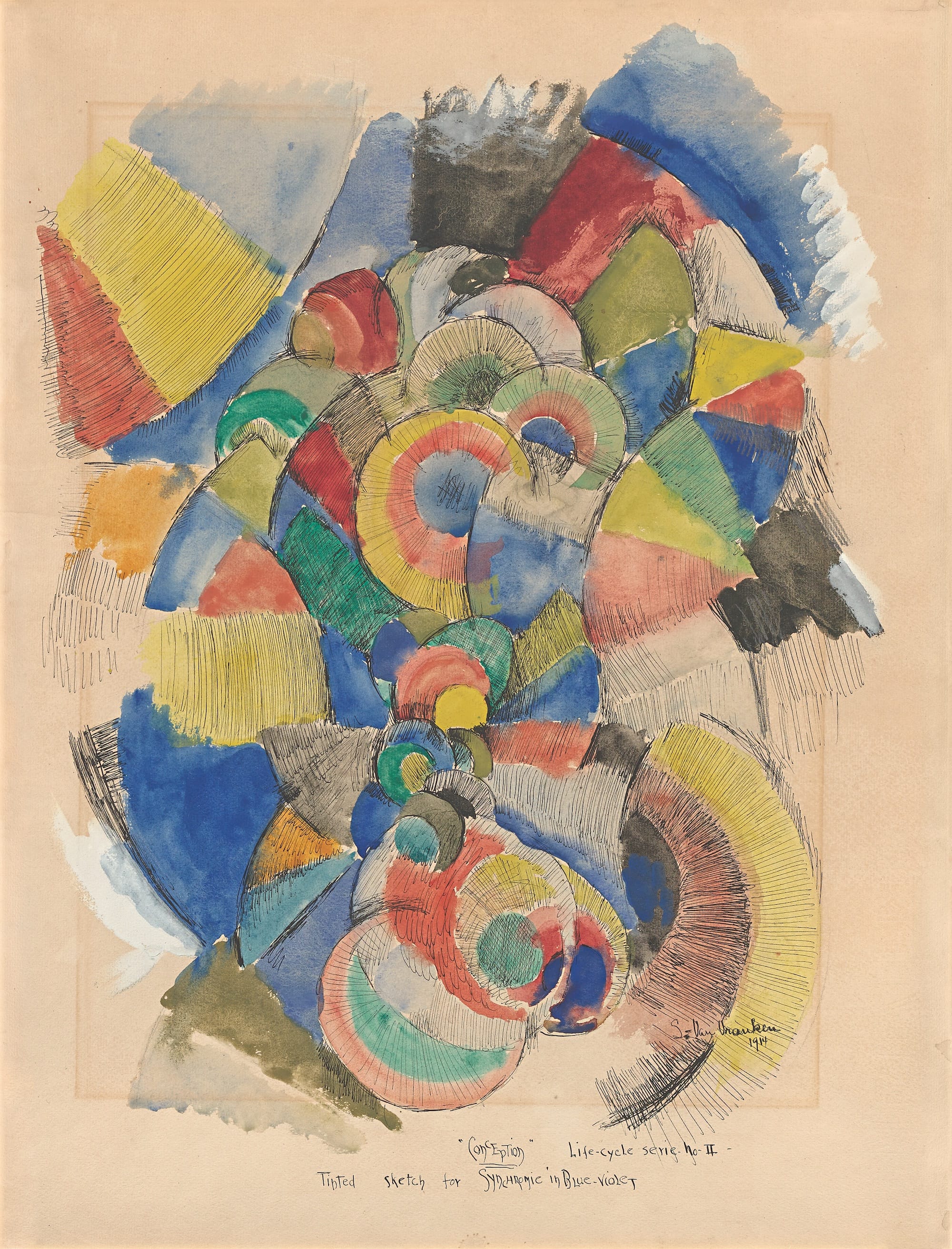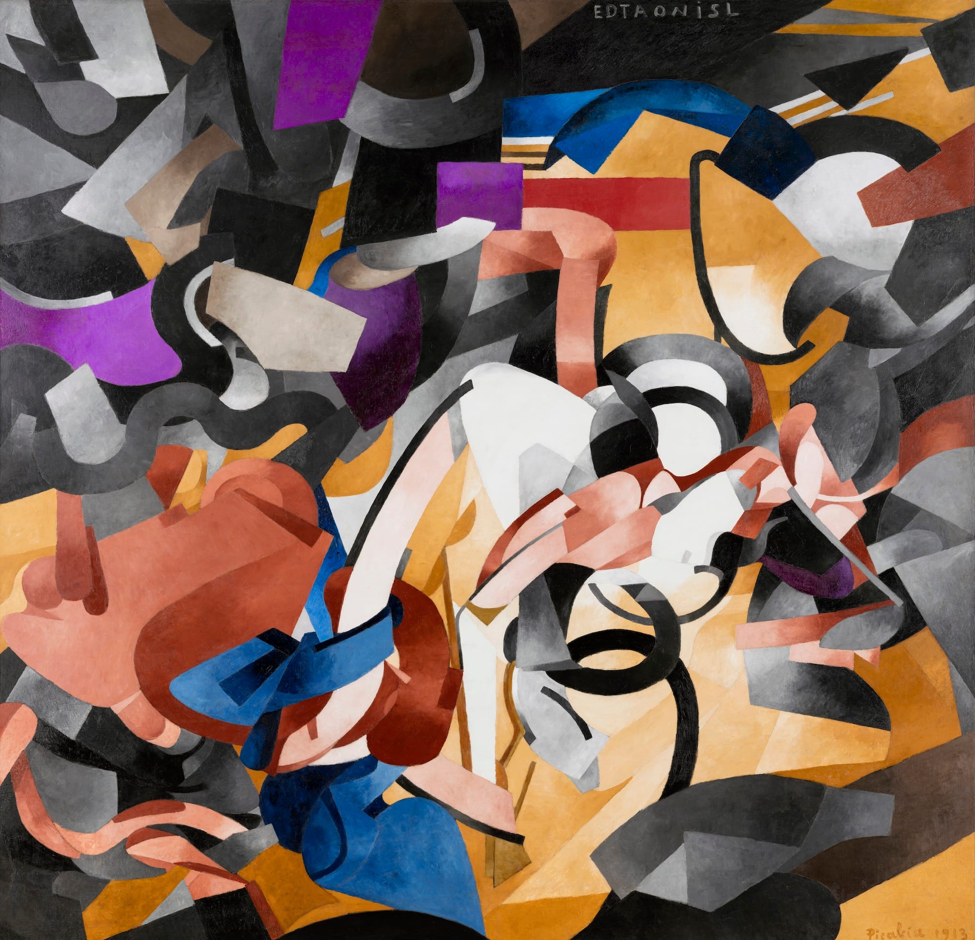 In 1912 or 1913, the poet Guillaume Apollinaire coined the term “Orphic Cubism” (the name alludes to the mythic poet Orpheus) to describe work with no obvious root in the visible world; that was less jarringly angular than its Cubist forebears; that was influenced by music; and focused on “pure aesthetic pleasure” and color and movement so far abstracted it became, in Apollinaire’s words, sublime. He named the works of Robert Delaunay, Francis Picabia, Fernand Léger, and Marcel Duchamp (and some by Picasso) as exemplars. At the Guggenheim, Delaunay’s work opens the show, followed closely by that of Sonia Delaunay, Picabia, and František Kupka, all known for their vibrantly colorful abstract paintings.