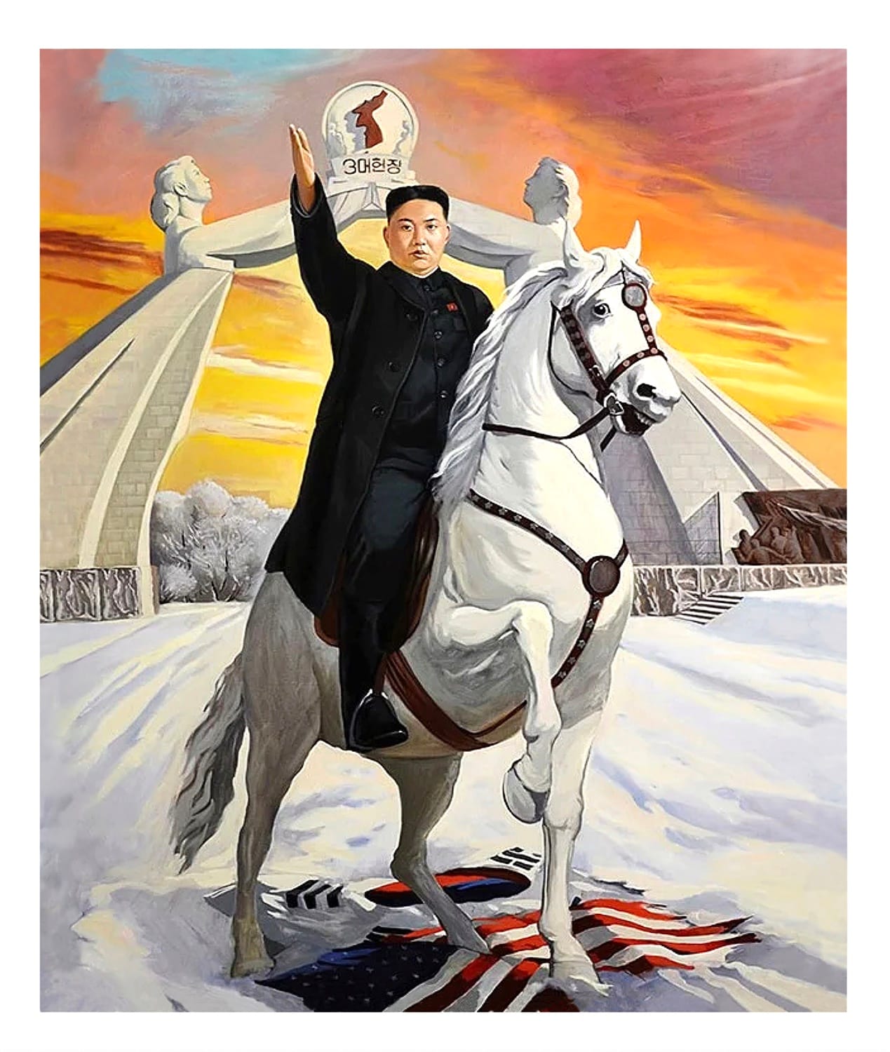 The cruelest and most beneficent regimes are equally responsible for some of the most ravishing images. A 1972 poster from the USSR, its design a nod to Rodchenko and the national aesthetic, shows a worker raising a muscled fist against a Ku Klux Klan member, with the legend “No to racism!” Two depictions from the 1940s glorifying Francisco Franco’s fascist rule are deceitfully luscious — the dictator draped in an absurdly long Spanish flag against a backdrop of roiling storm clouds; a stylized Death on horseback flying over a globe consumed by fiery conflict except for peaceful Spain — while a 1999 painting from Iraq picturing Saddam Hussein in a Mesopotamian chariot wielding a bow and arrow while missiles and warplanes fill the sky is both goofy and gorgeous, as well as a warning about the disastrous fates that so often befall cults of personality. (Turns out a populace will only tolerate absolutism for so long when it ends in savagery to themselves as well as to their enemies; Saddamism was put to death along with its charismatic creator in 2006.)
