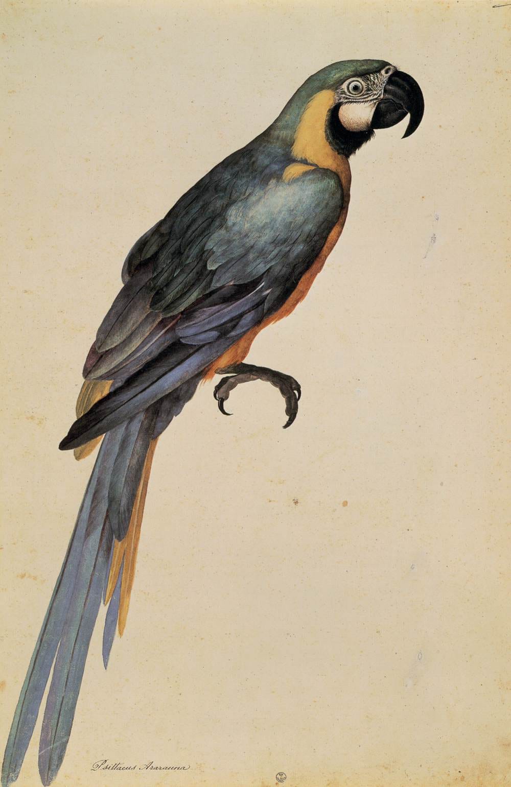 In a 1599 woodcut by Italian artist Ferrante Imperato, Cosimo’s room of curiosities appears overstuffed with preserved animals adorning every square foot of the mansard-roofed abode, including a swordfish, crab, pelican, and crocodile directly overhead. There are also several birds, some of which could be macaws — but it’s hard to be sure. While Imperato’s woodcut is adept, and certainly conveys the sense of wordliness Cosimo desired in his commission, the animals appear more allegorical than real, creatures from an alchemical text or a Medieval bestiary rather than nature, more basilisk than Crocodylus niloticus. Even at the dawn of the Scientific Revolution, the operative concern was not empirical observation, but the impartation of wonder (and power, wealth, etc.). Images, therefore, were to depict not the animals themselves, but imagined ideas of them. Parrots, the cousins to macaws known even to the Ancient Greeks as unforgiving chatterboxes, were long depicted mythically rather than faithfully to life. In a French medieval bestiary from the middle of the 15th century now held by the Huis van het Boek in the Hague, Netherlands, for instance, a blank-eyed and green-feathered parrot faces left upon a grassy, green earth beneath a stylized cobalt-blue sky, his positioning reminiscent of heraldry, an animal sejant erect to dexter (standing erect to the right), to use the jargon of that format. This is not a parrot, but a fantasy of one.