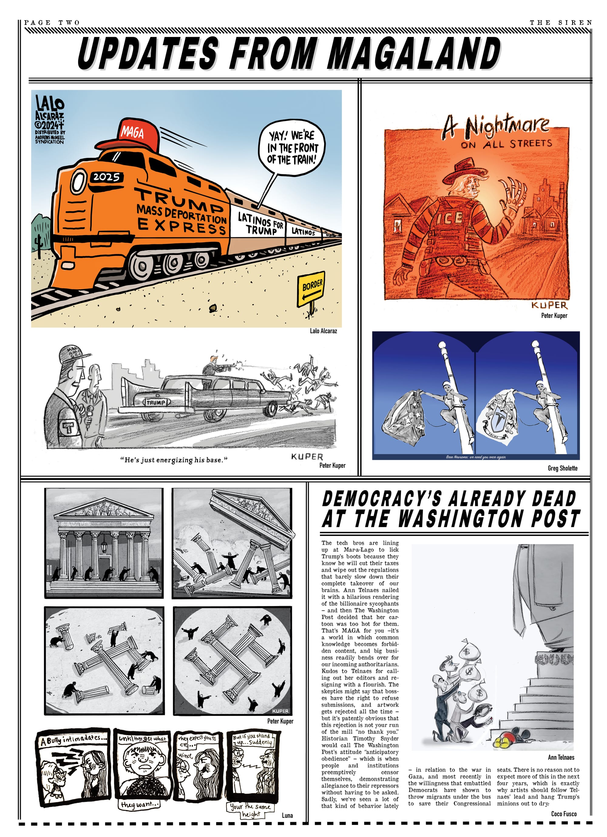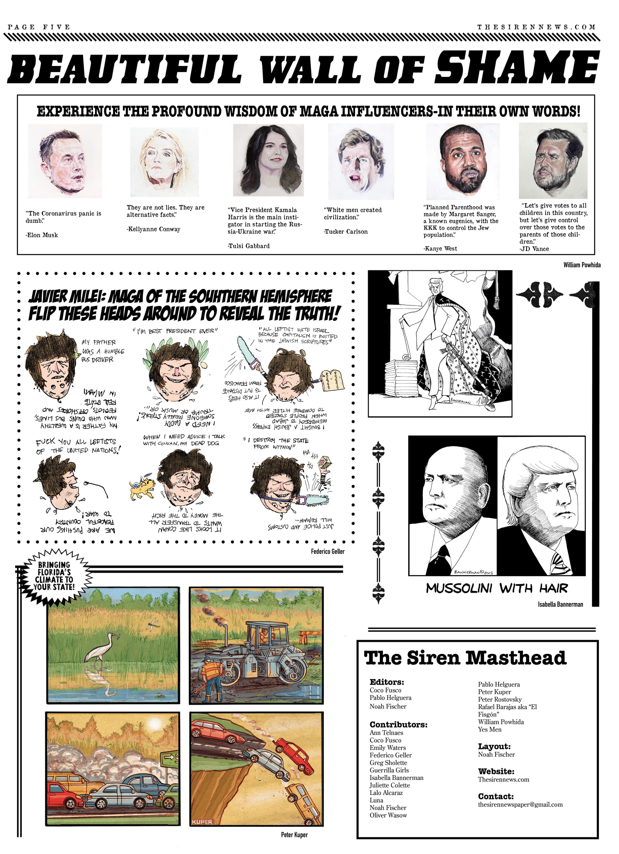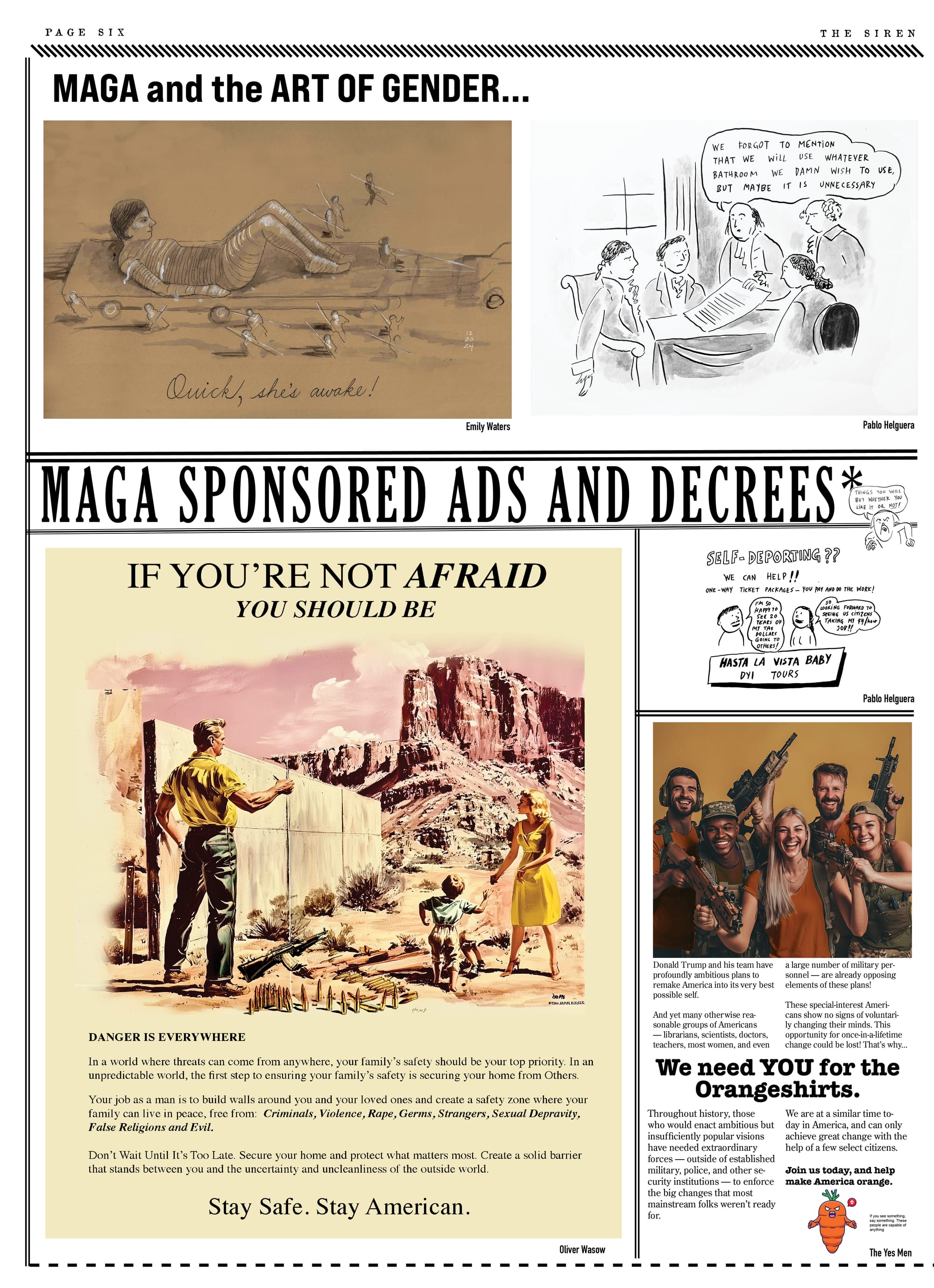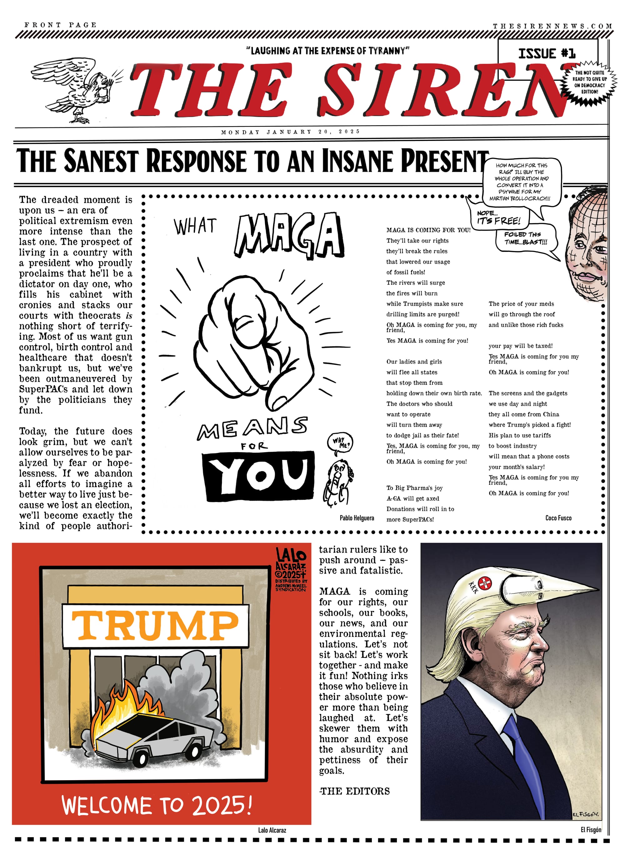 In the days after the 2024 election, I got my fill of mea culpas from disheartened Democrats and fatalistic "what else can we expect from politics?" dismissals from people around me. Shortly thereafter, I visited the Mexican Prints at the Vanguard exhibition at the Metropolitan Museum of Art and was deeply moved by the ingenuity and vitality of the cartoons and posters. I recall my sense of awe at the brilliant satirical depictions of authoritarianism that José Guadalupe Posada created about the Porfirio Díaz dictatorship and my laughter at the rhymes lampooning the rich and powerful. Before I left, I started thinking to myself that I should try to do the same. So I contacted my colleagues Pablo Helguera and Noah Fischer and pitched the idea of a publication to them. Lucky for me, they immediately agreed. I've been amazed at the willingness of so many of our colleagues to share their work with us for the first issue of The Siren. Here is the sanest response we could come up with to our utterly insane times. May it sharpen our wits! —Coco Fusco