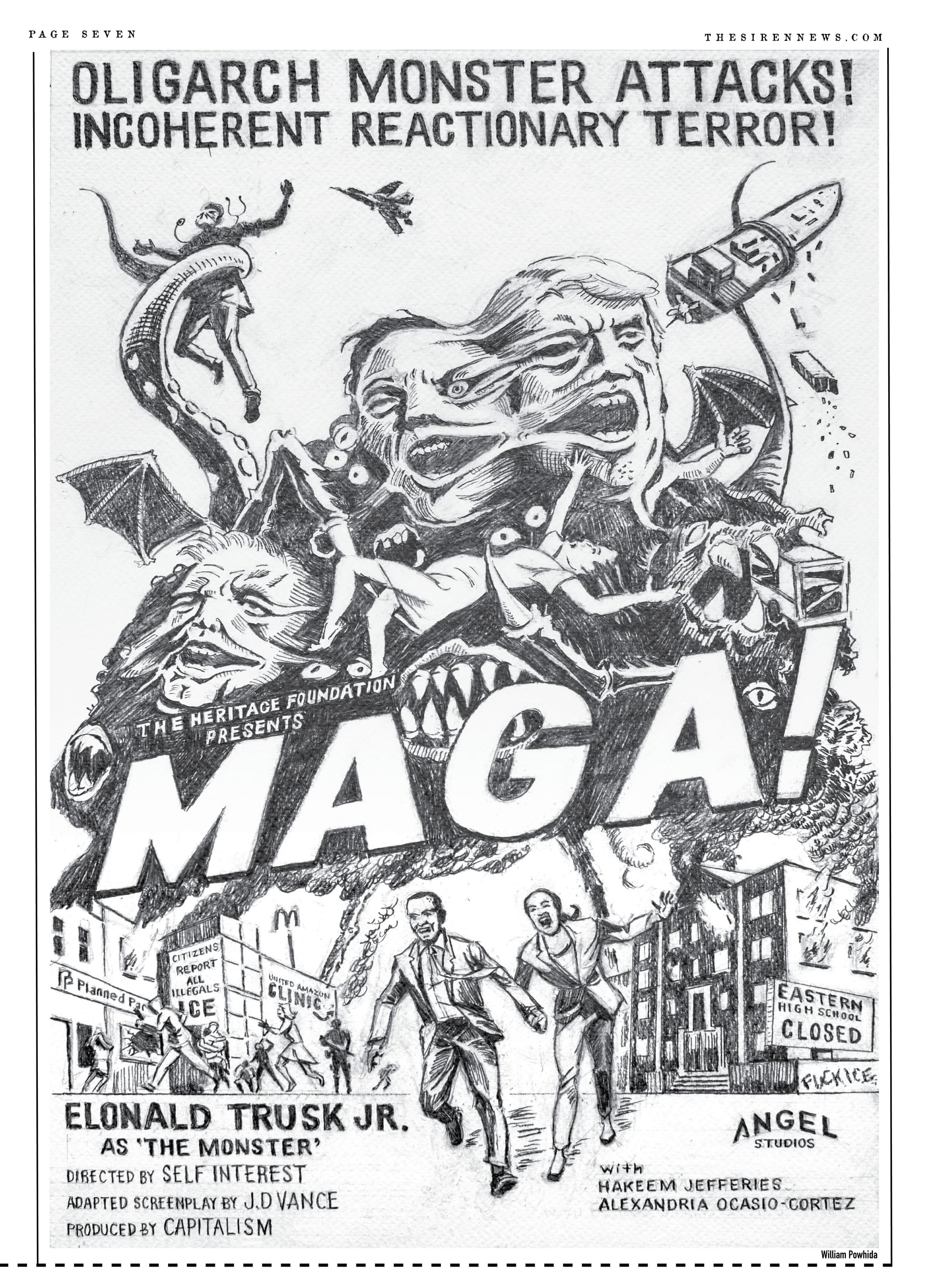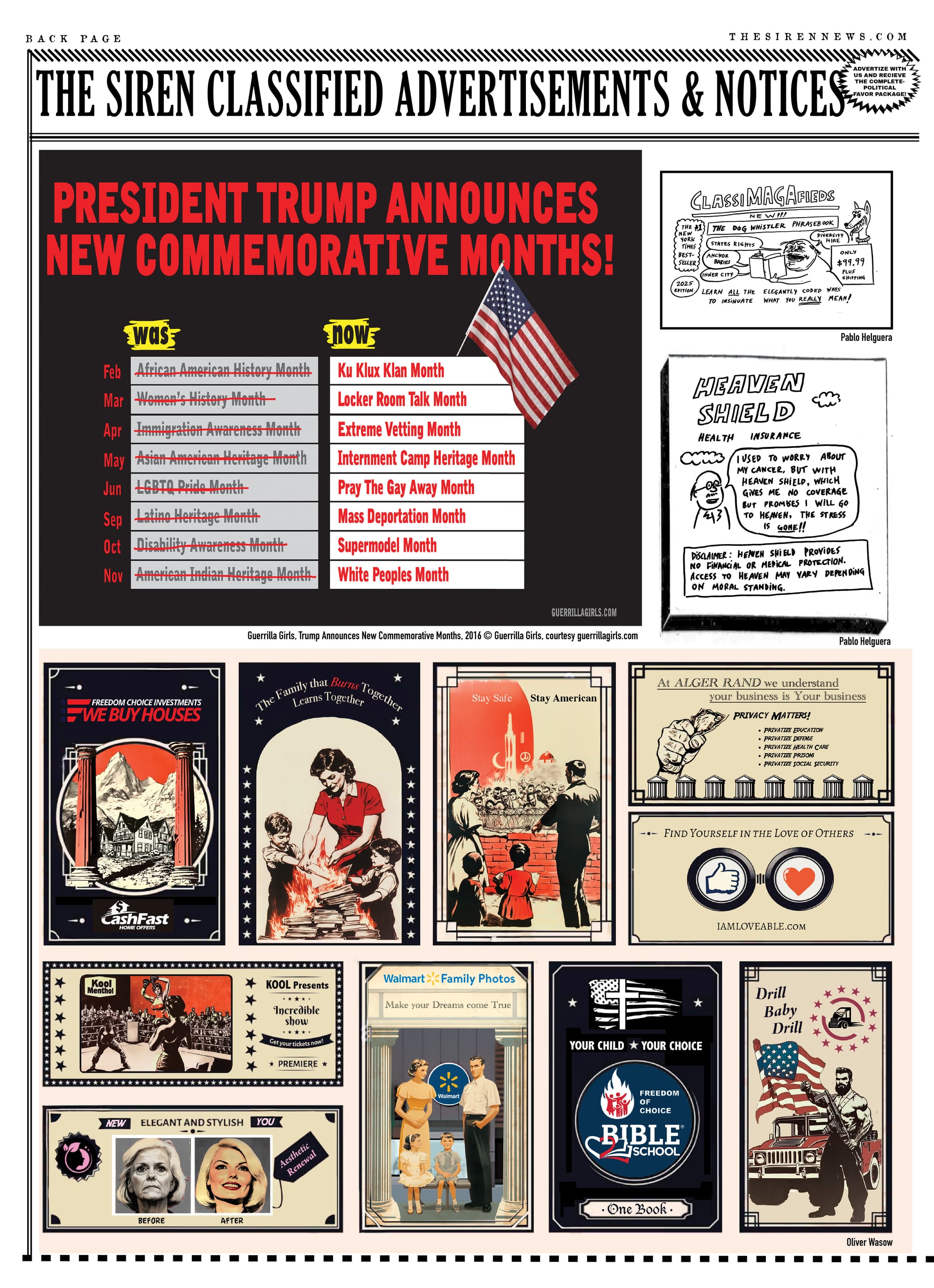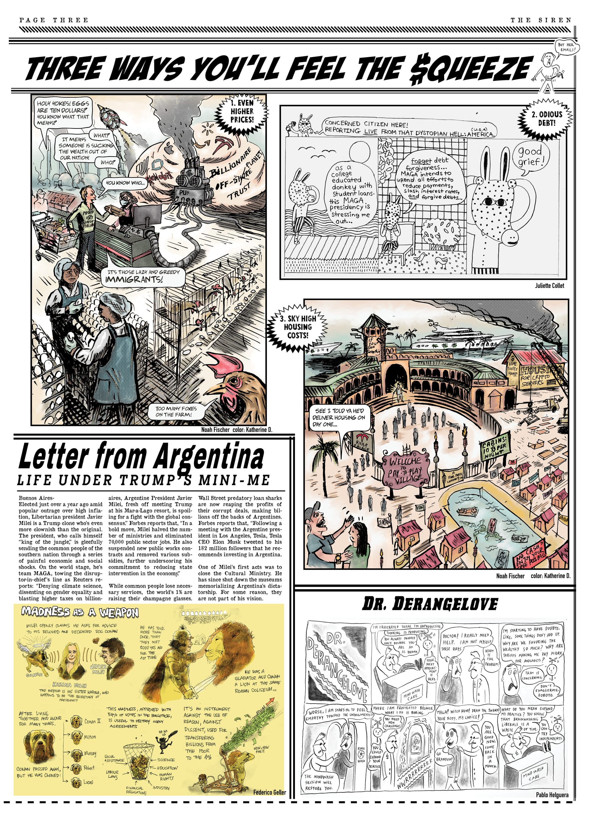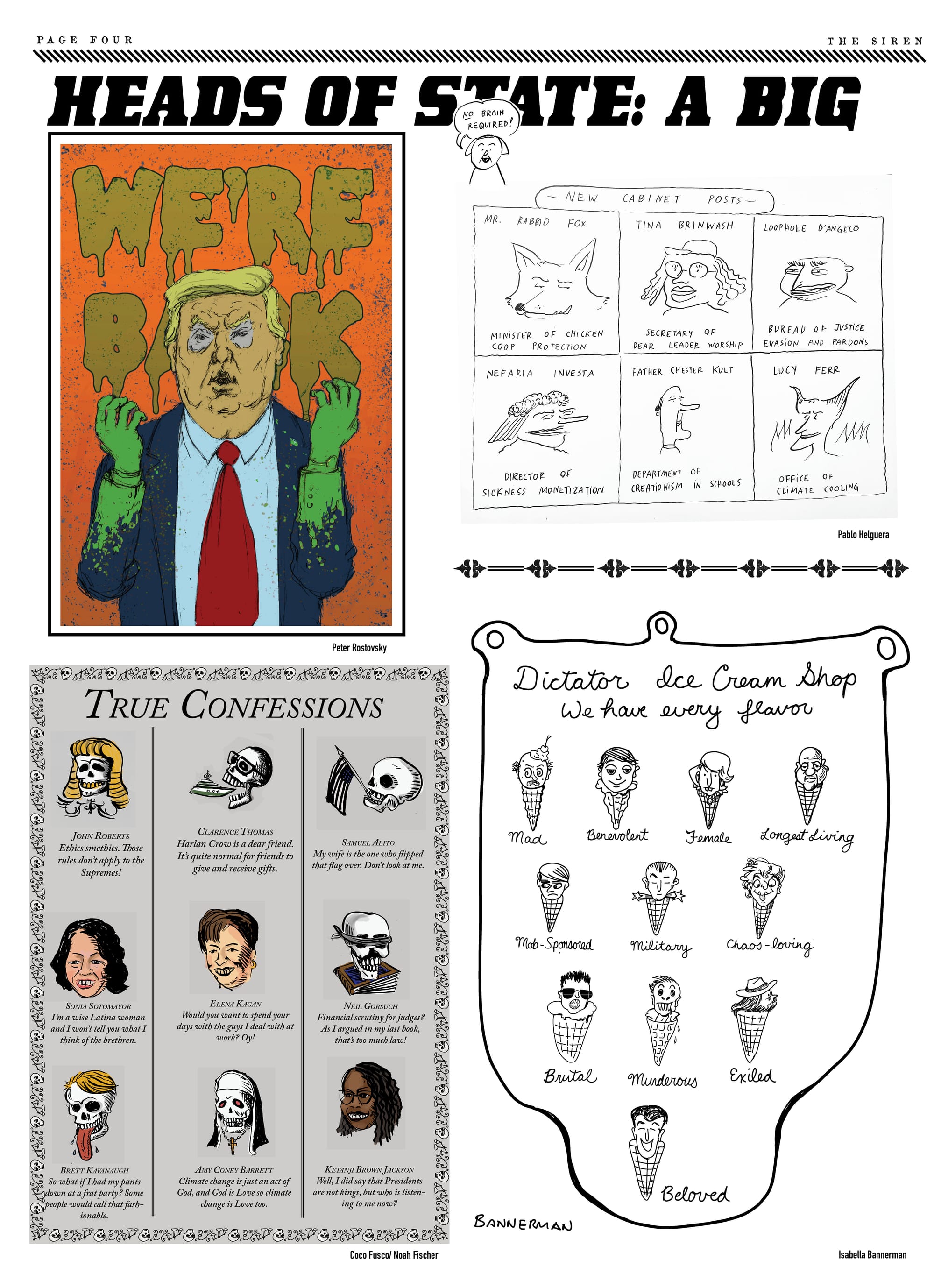 In the days after the 2024 election, I got my fill of mea culpas from disheartened Democrats and fatalistic "what else can we expect from politics?" dismissals from people around me. Shortly thereafter, I visited the Mexican Prints at the Vanguard exhibition at the Metropolitan Museum of Art and was deeply moved by the ingenuity and vitality of the cartoons and posters. I recall my sense of awe at the brilliant satirical depictions of authoritarianism that José Guadalupe Posada created about the Porfirio Díaz dictatorship and my laughter at the rhymes lampooning the rich and powerful. Before I left, I started thinking to myself that I should try to do the same. So I contacted my colleagues Pablo Helguera and Noah Fischer and pitched the idea of a publication to them. Lucky for me, they immediately agreed. I've been amazed at the willingness of so many of our colleagues to share their work with us for the first issue of The Siren. Here is the sanest response we could come up with to our utterly insane times. May it sharpen our wits! —Coco Fusco