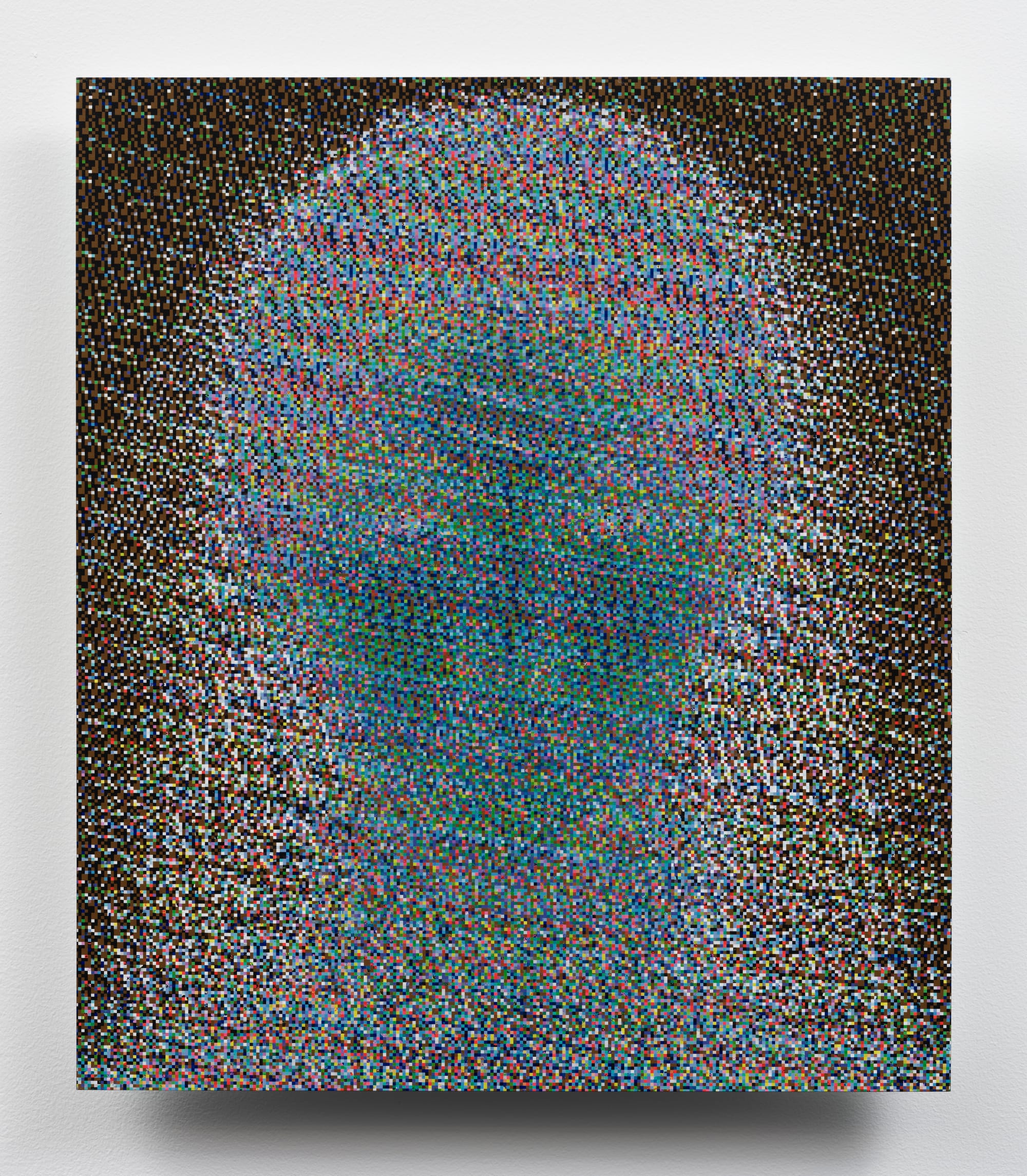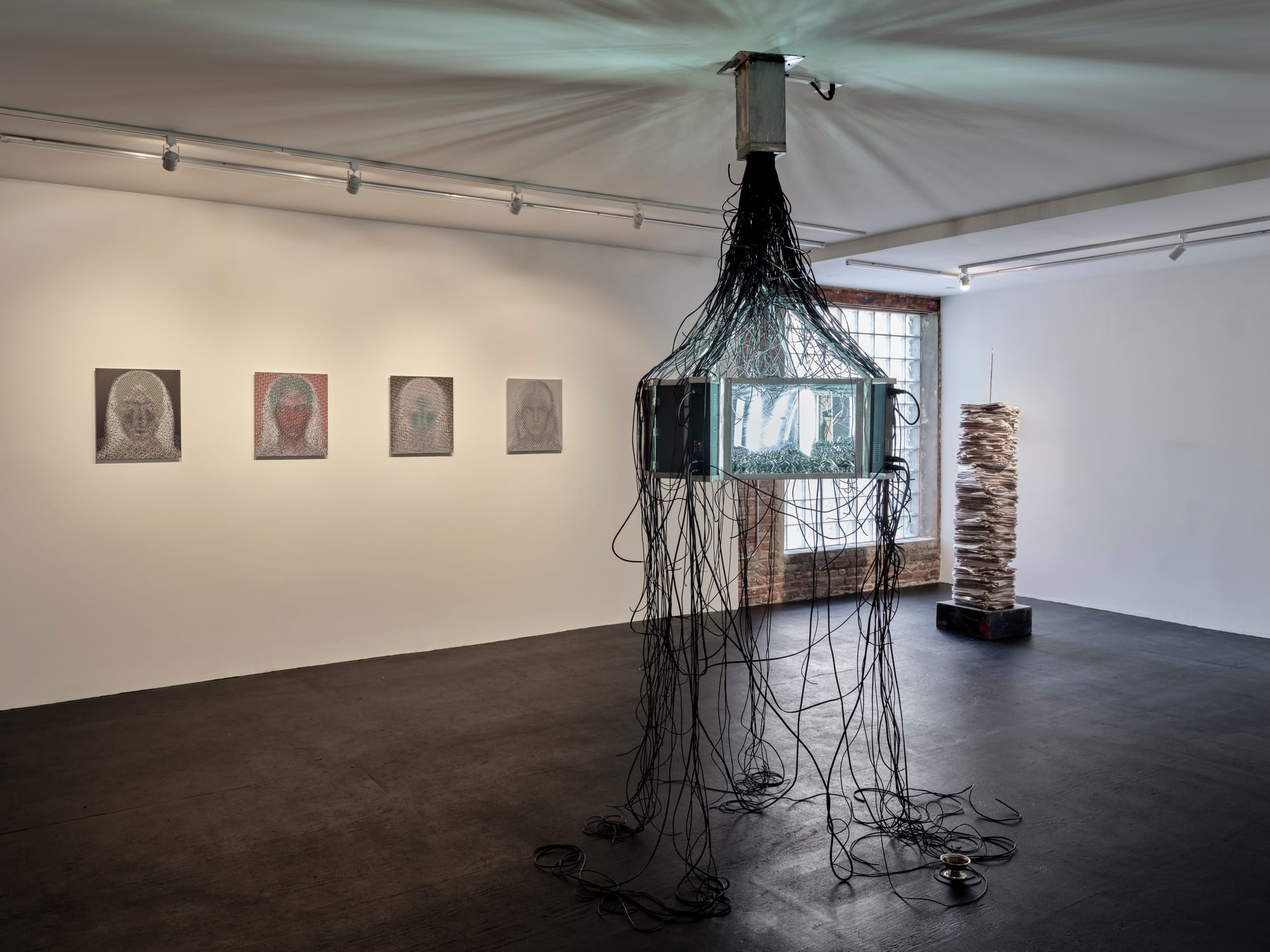 A number of the works in the exhibition relate to technology. Damon Zucconi’s digital paintings deploy algorithms to weave together sundry disarticulated and abstracted government document images to create four portraits of spectral female faces shrouded in light. The works confront how human likeness was historically recognized as facsimile, a composite of the subject’s idealized self and the painter’s sympathy or honesty, and has since become simultaneously a far more rigid legal category and also a site of agency due to digital tools and the internet. Alex Ito’s “witness” (2024), in which a dynamic central panel of silver nitrate chrome and oxidized iron powder shifts and changes with time and its surroundings, also speaks to the social media age. This reflective core draws viewers in, while dark panels flanking it bear the imprints of neon hands that recall the way flesh might appear on a heatmap, the mark of someone trying to but unable to enter. While we're drawn to these reflections of ourselves, believing they connect us, it suggests, digital imagery often masks real-world conflict and division rather than bridging it.